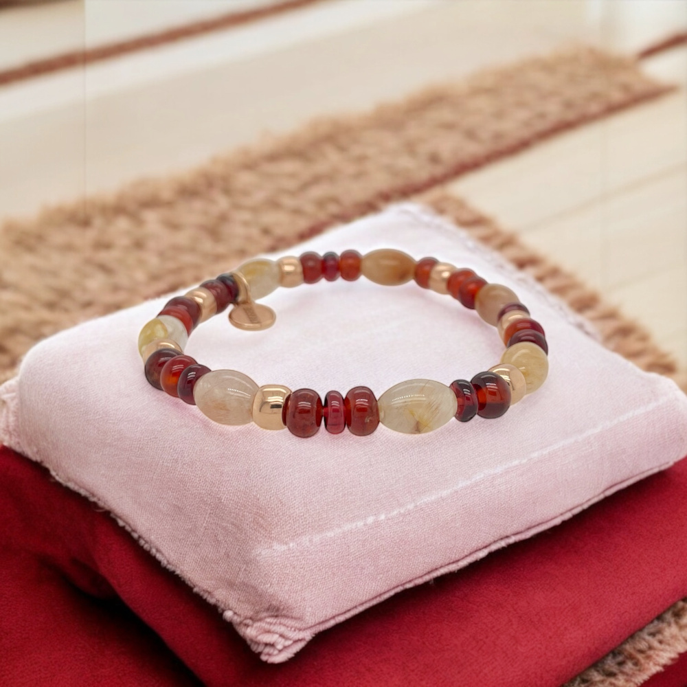 Verschillende edelstenen vormen samen met 7 roségouden ornamentjes en het Bron label een prachtig geheel. De verschillende tinten en grootte van de Rutielkwarts en rhodoliet passen perfect bij elkaar. De armband is fantastisch om solitair te dragen maar geweldig om te combineren met andere armbanden. Dit model is onderdeel van de ''reflex''-collectie, eindeloos - flexibel en ademt ongedwongen luxe!