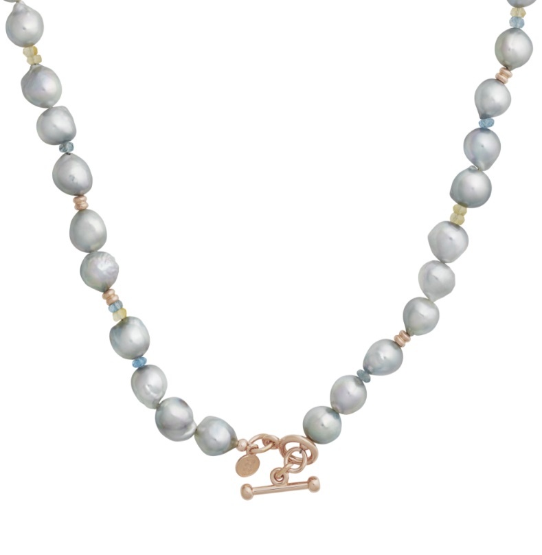 Een fantastisch collier van glanzende, blauwe Akoya parels. De barok parels worden afgewisseld door speelse roségouden ornamenten of door de vrolijke kleuren van Aquamarijn en Citrien. De verschillende tinten van het collier passen precies bij de ijspastel kleuren van 2024. Dit model is onderdeel van de 'LighthouseSS24'-collectie, toepasselijke ontwerpen en kleuren die levensvreugde en lichtvoetigheid uitstralen.