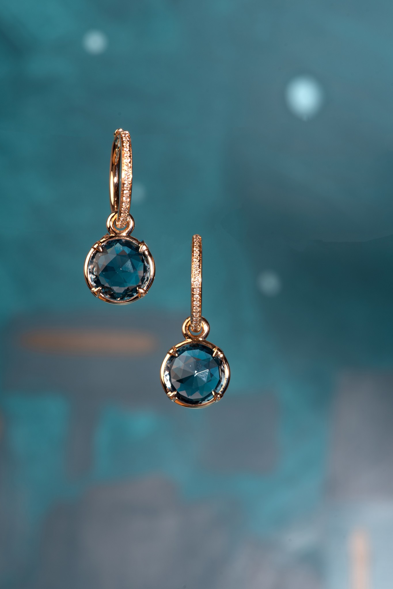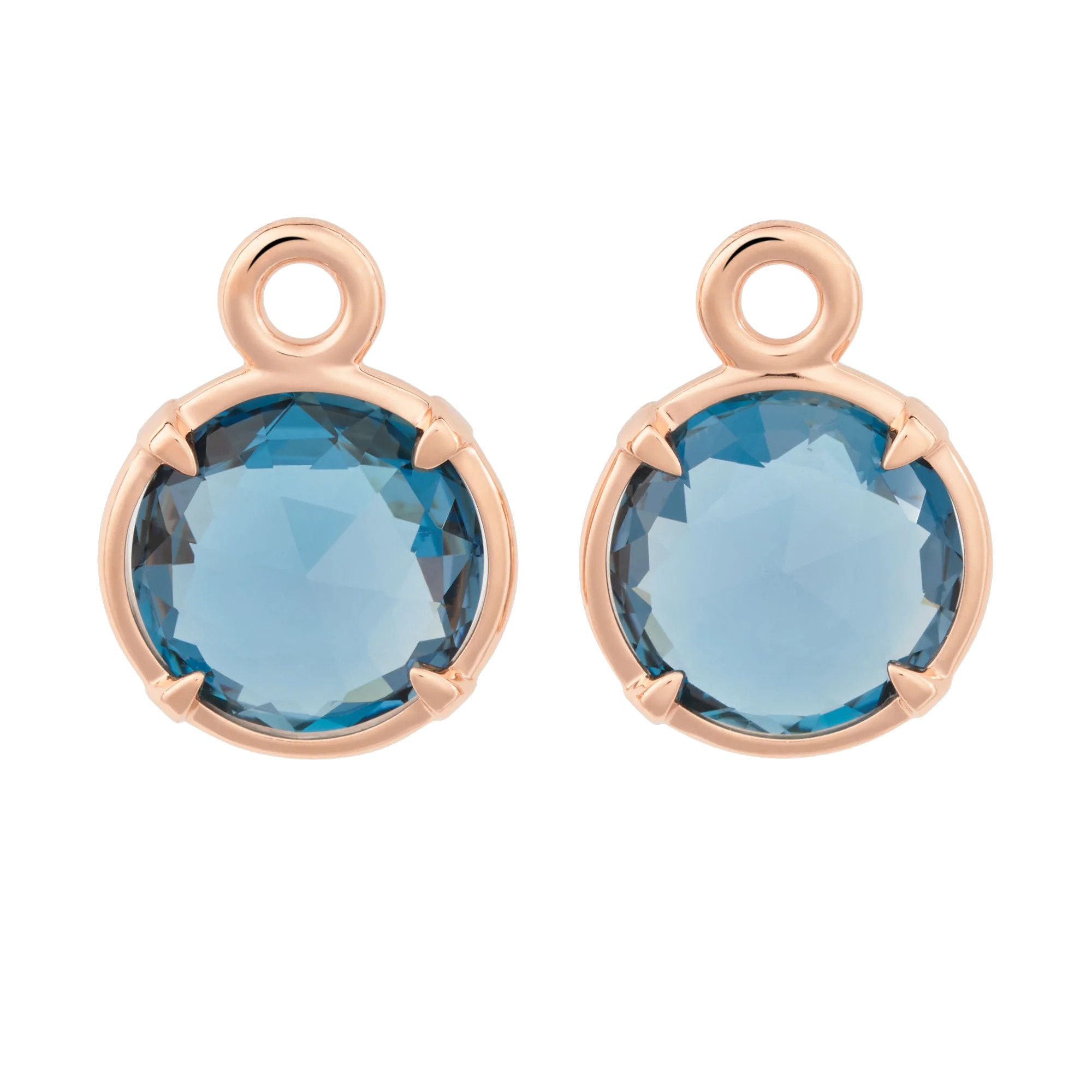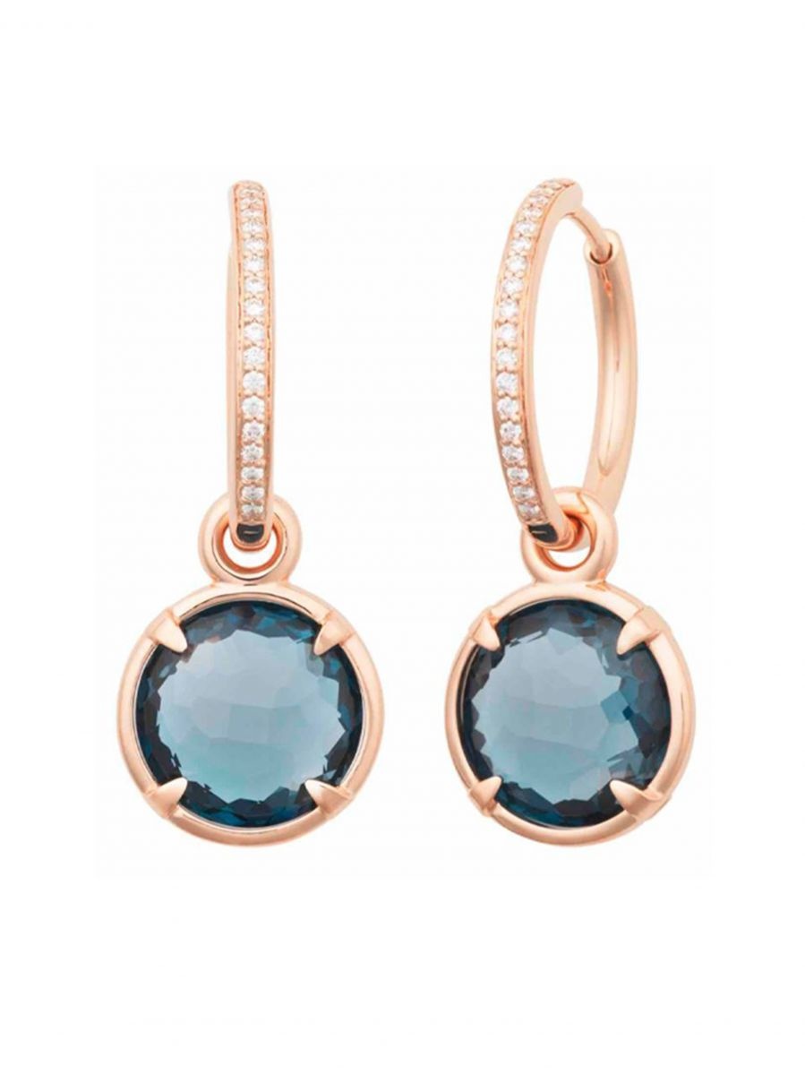 Prachtige roségouden creoolaanhangers met London Blue Topaas. De edelsteen is 12mm en is facet geslepen. Deze slijpwijze noemen wij briolet en wordt speciaal voor BRON op deze manier geslepen. Ze komen extra goed tot hun recht in de Mira Mira aanhangers die door hun spel met het licht voor maximaal effect zorgen. Deze creoolaanhangers worden geleverd zonder creolen, en kan aan je eigen creolen of aan een van de vele Bron creolen gedragen worden. Dit model is onderdeel van de 'Mira Mira'-collectie, wat kijk betekend. Geplaatst in een open zetting vormt de Amethyst, Citrien, Hessoniet of Topaas een kleurig raampje dat van beide zijden licht doorlaat. Mira Mira!