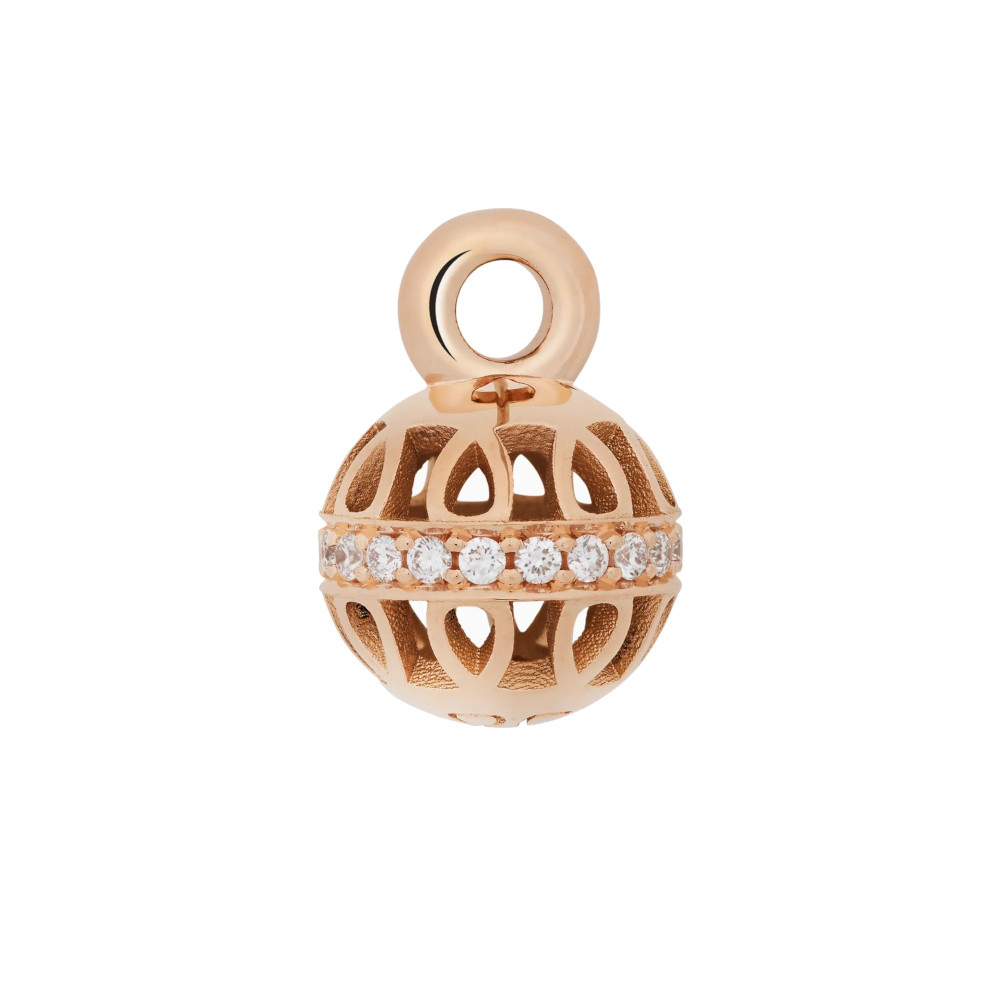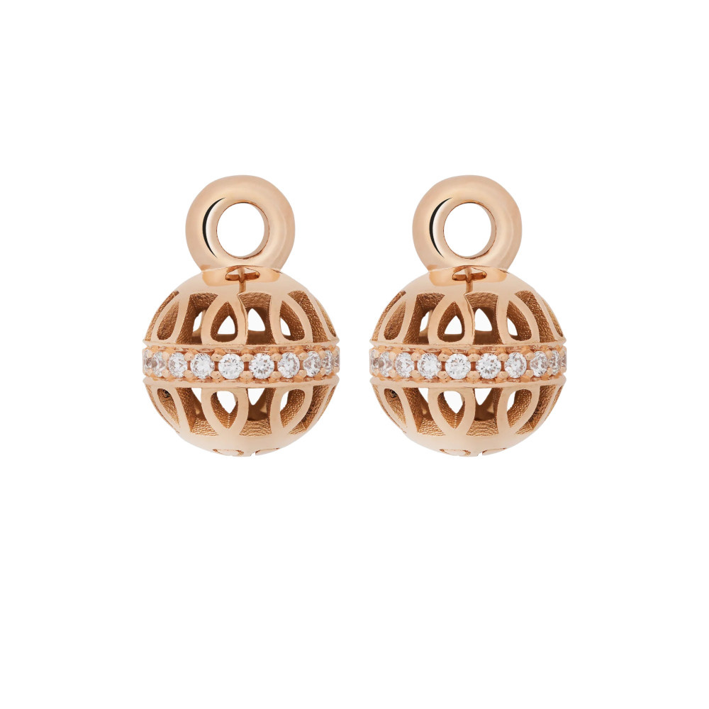 Deze roségouden aanhangers maken je creolen helemaal af. Ze hebben een schattige, bolle vorm en zijn speels opengewerkt met een donker gerhodineerde binnenkant. Het randje met briljanten zorgt voor een subtiele schittering en in totaal zit er 0.34ct. in verwerkt. Deze creoolaanhangers worden geleverd zonder creolen, en kan aan je eigen creolen of aan een van de vele Bron creolen gedragen worden. Deze hanger is onderdeel van de 'Toujours Ajour'-collectie, een mysterieuze familie die je langzaam moet uitpakken en ontdekken.