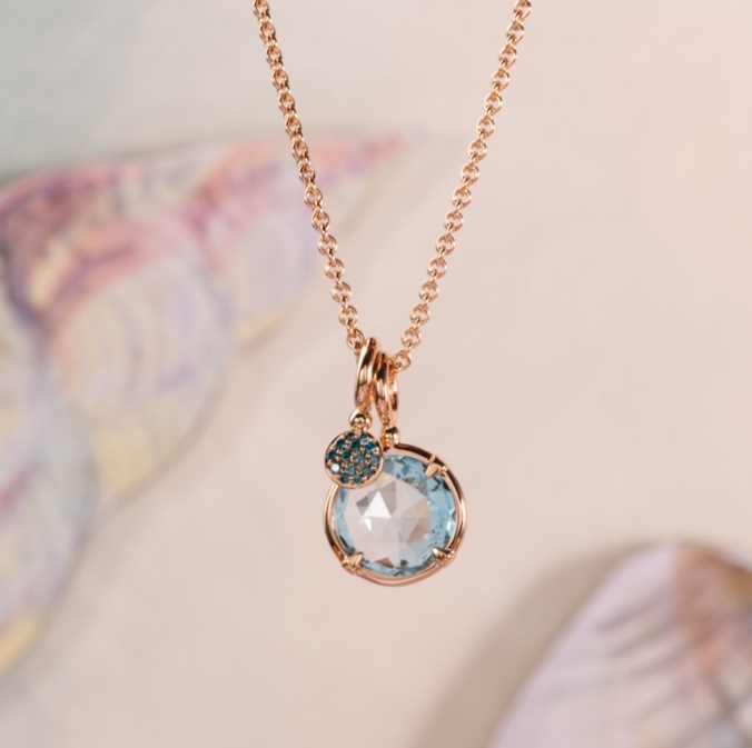 Een prachtige roségouden hanger met een hemelsblauwe Topaas. De steen is 12mm en facet geslepen. Deze slijpwijze noemen we briolet. Deze hanger wordt geleverd zonder collier, en kan aan je eigen collier of aan een van de vele Bron colliers gedragen worden. Dit model is onderdeel van de 'Mira Mira'-collectie, wat kijk betekend. Geplaatst in een open zetting vormt de citrien, hessoniet of topaas een kleurig raampje dat van beide zijden licht doorlaat. Mira Mira!