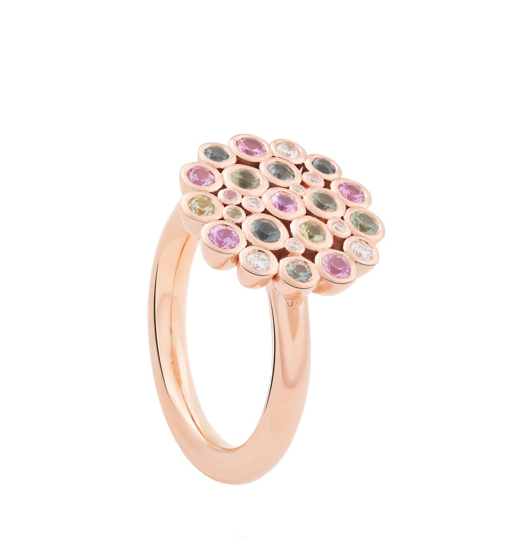 De kleinere versie van de Terrazzo ring in verschillende saffierkleuren gecombineerd met diamant. De verschillende tinten van de edelsteen passen precies bij de Bronissimo kleuren van 2025. Als puzzelstukjes vallen zij samen en vormt de ring een prachtig geheel. Dit model is onderdeel van de 'Confetti'-collectie, sprankelend, uitbundig en smaakvol. De ronde kastjes omarmen een mix aan edelstenen in alle kleuren van de regenboog – met Confetti is alles mogelijk!