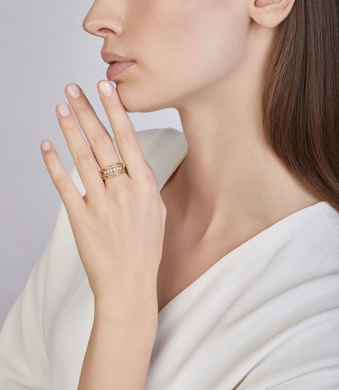 Een prachtige ring waarbij meerdere banen in de kleur yellow sunrise gold naast en over elkaar heen lopen. Tussen de mat/glanzende banen loopt in het midden een rij met zes subtiele maar opvallende diamanten. Om de briljanten optimaal te laten schitteren zijn zij in een witgouden zetting geplaatst en in totaal zit er 0.17ct. in verwerkt.