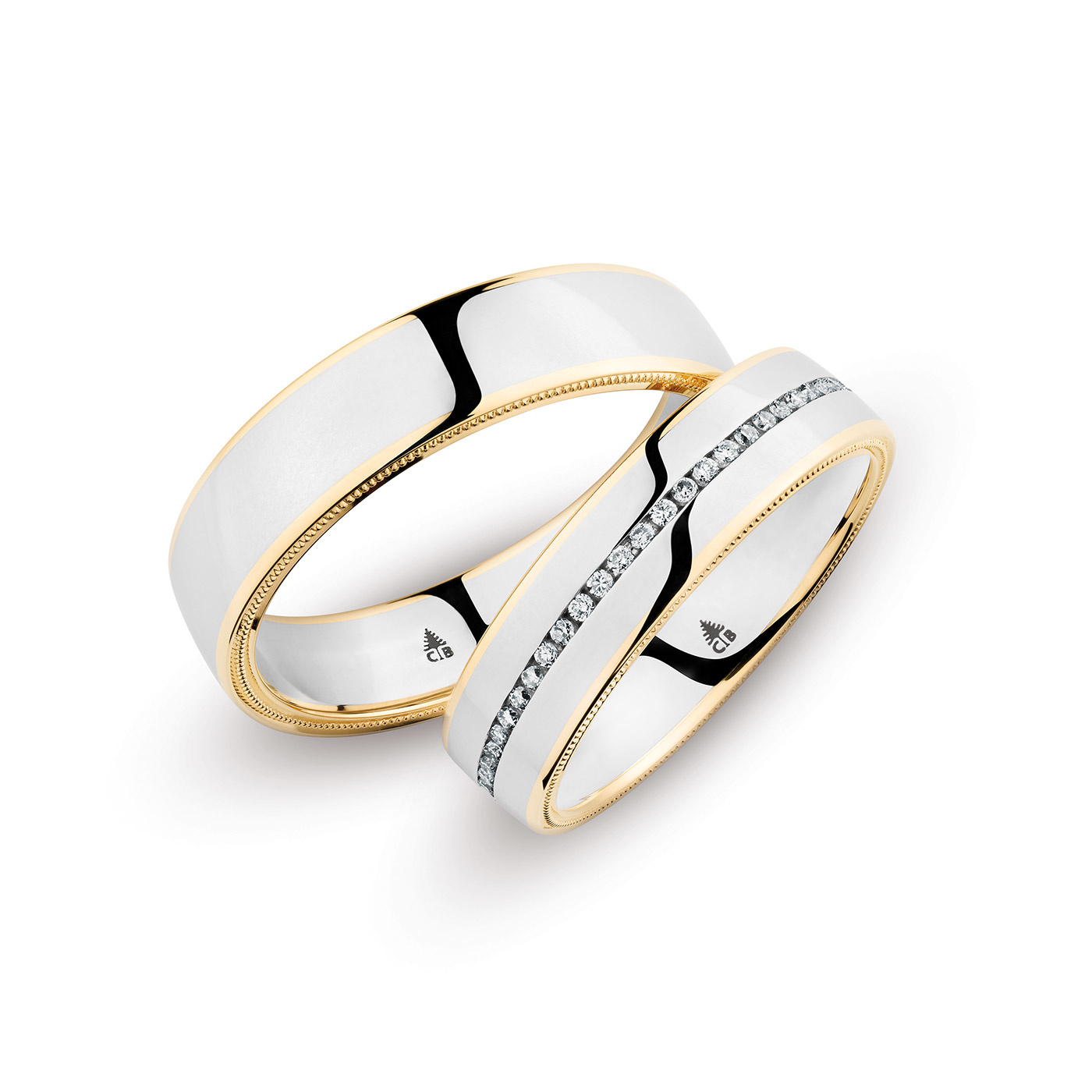 De damesring is 4mm breed en heeft 19 briljanten 0,075ct TW-SI. De herenring is 5mm breed. Deze mooie combinatie is tijdloos en stijlvol.