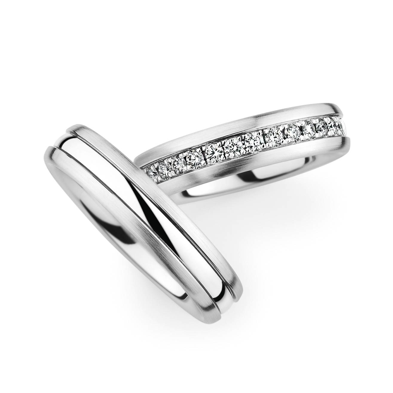 De damesring is 5mm breed en heeft 16 briljanten 0,35 TW-SI. De herenring is ook 5mm breed. Deze mooie combinatie is tijdloos en stijlvol.