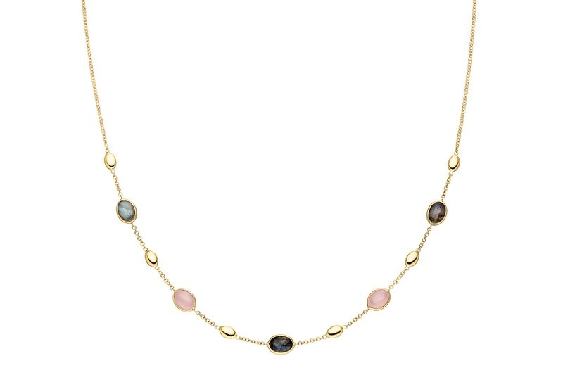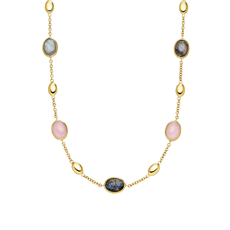 Artikelnummer: 612473Dit geelgouden collier is fijn en vrolijk versiert met de prachtige ovaal geslepen labradoriet en rosekwarts, en gemakkelijk draagbaar. De edelstenen zijn gezet in een gouden zetting en afgewisseld met kleinere ovale ornamenten geheel van geelgoud. Het collier is in de hals voorzien van een stevige karabijnsluiting en een verlengkettinkje, om het te kunnen dragen op diverse lengten.