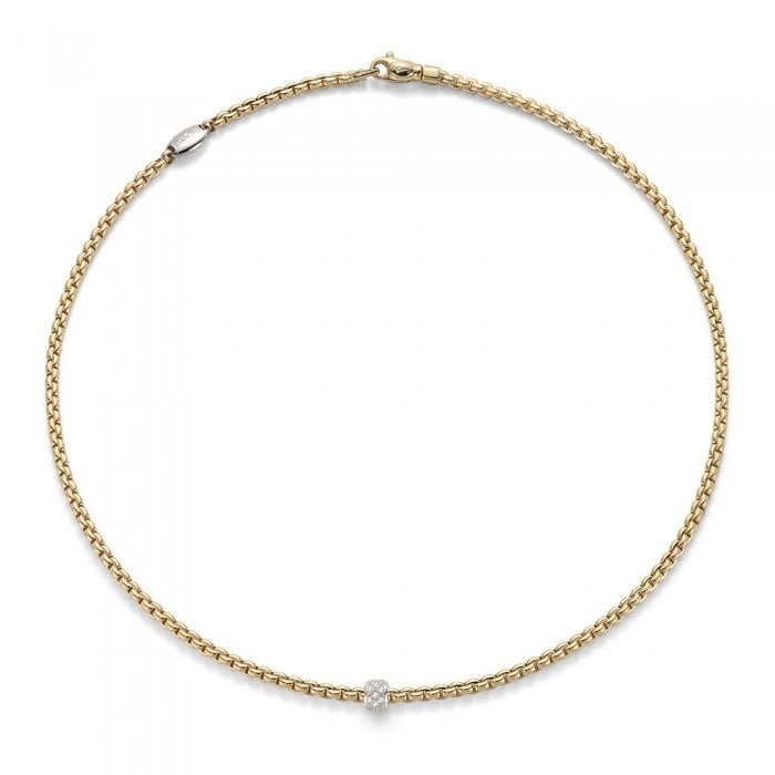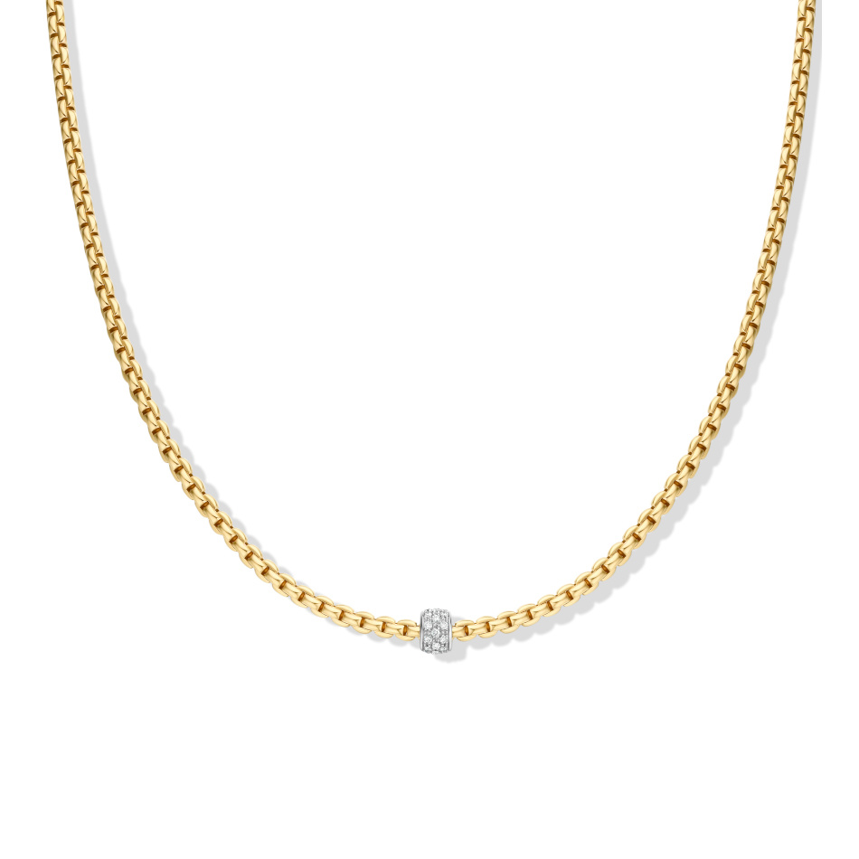 Een prachtig geelgouden collier uit de Eka Tiny collectie van het Italiaanse merk Föpe. Gemaakt uit 100% hoogwaardig 18k geelgoud. Het collier wordt versierd met een vast ornament dat pavé bezet is met diamant. Om de briljanten optimaal te laten schitteren zijn zij in een witgouden zetting geplaatst en in totaal zit er 0.19ct in het collier verwerkt.