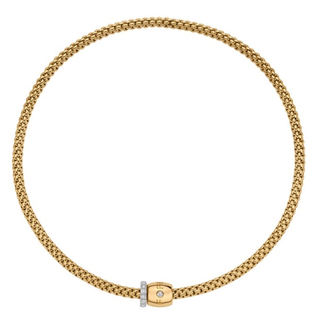 Een prachtig geelgouden collier uit de Solo collectie van het Italiaanse merk Föpe. Gemaakt uit 100% hoogwaardig 18k geelgoud. De fijne schakels geven een speels, tijdloos & alledaags draagbaar structuur. Het collier heeft twee ornamenten, dicht naast elkaar waarvan één rondom bezet is met briljanten. Om de diamanten optimaal te laten schitteren zijn zij in een witgouden zetting geplaatst en in totaal zit er 0.47ct in dit collier verwerkt.