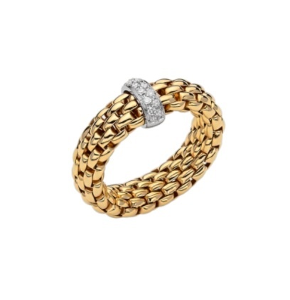 De fijne schakels geven een speels, tijdloos & alledaags draagbaar structuur aan deze Fope ring. De ring wordt versierd met een ornament die pavé bezet is met diamant. Om de diamanten optimaal te laten schitteren zijn zij in een witgouden zetting geplaatst en in totaal zit er 0.10ct in deze ring verwerkt. Flex’it-ringen weerspiegelen het concept van flexibiliteit, net als de gelijknamige armbanden. Dit betekent dat uw ring aanpasbaar is, zodat u ervoor kunt kiezen hem om een andere vinger te dragen en dit op elk moment van de dag comfortabel voelt, wat u ook doet.