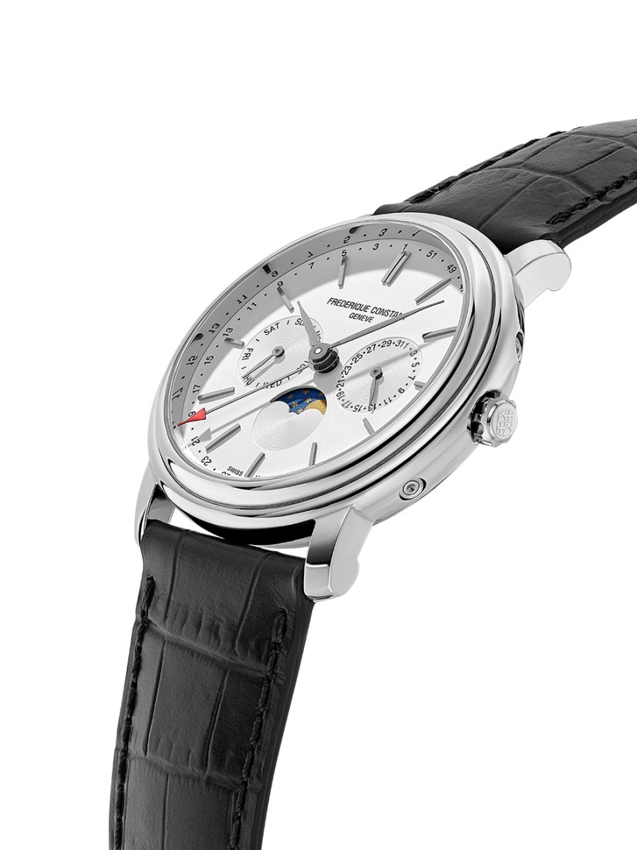 Dit Frederique Constant FC-270SW4P26 herenhorloge is een elegante verschijning met een verfijnd gegraveerde witte wijzerplaat, prachtig gemaakt met een krasvast saffierglas. Voorzien van een maanstand, dag/datum en week aanduiding. De afgeronde kast heeft een diameter van 40mm en draagt comfortabel.