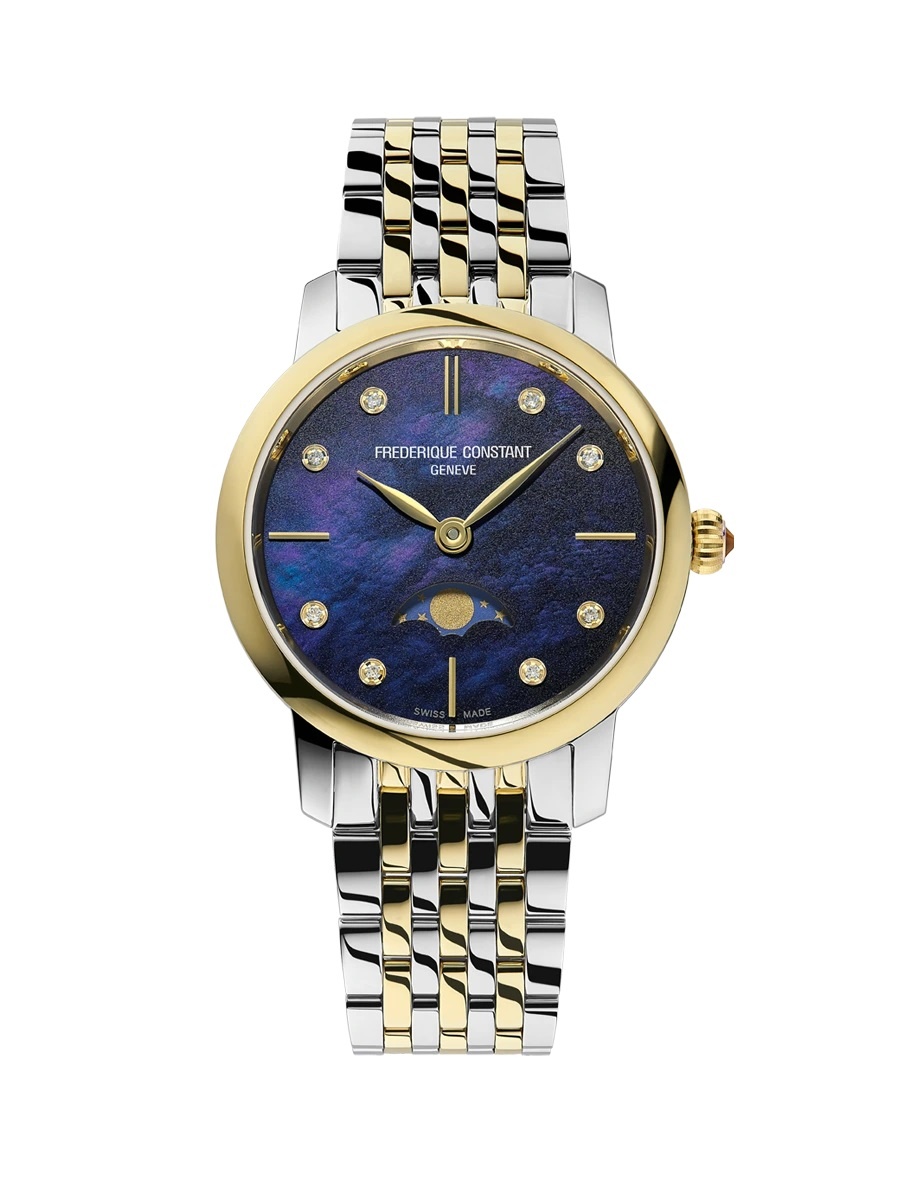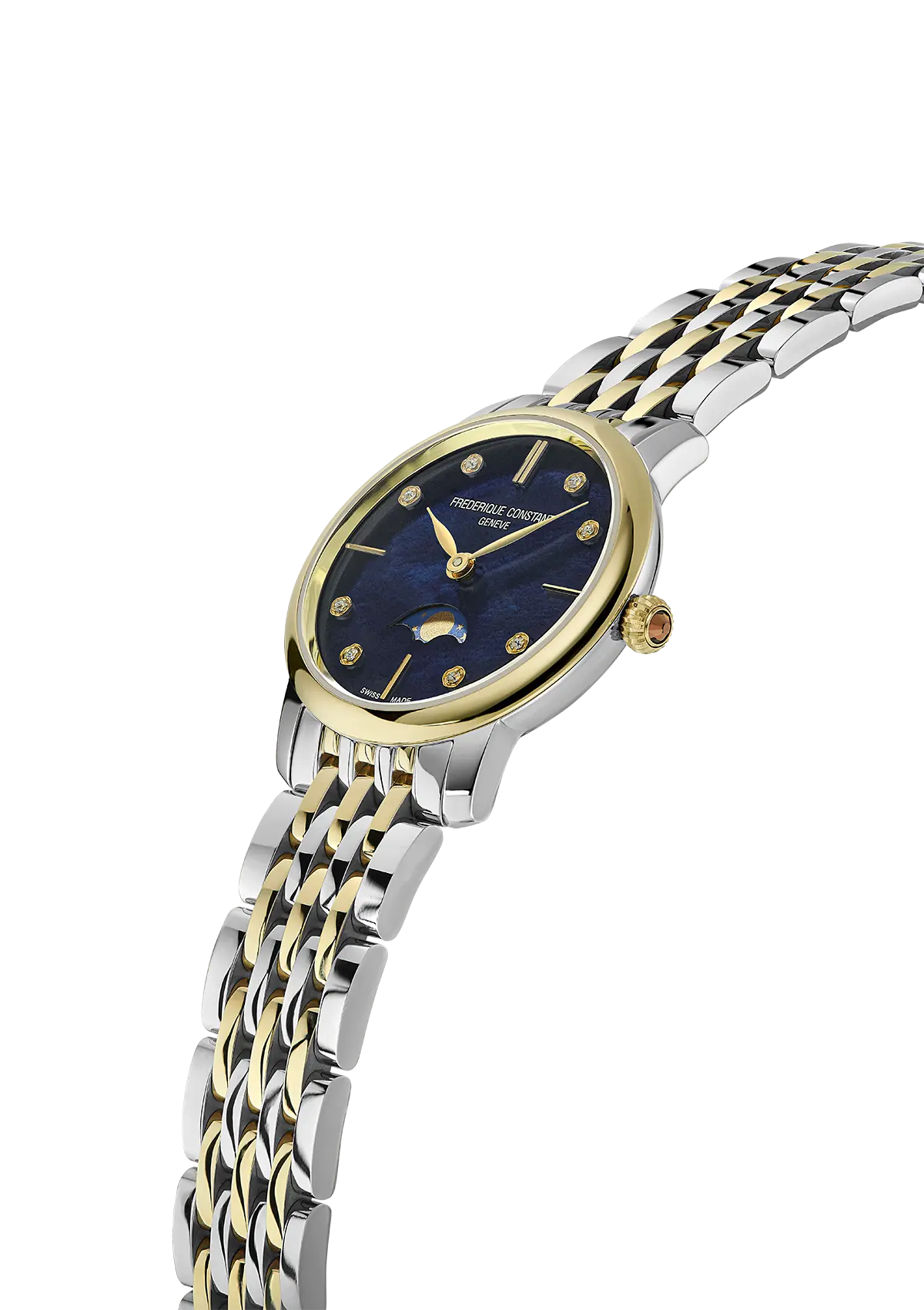 Artikelnummer: FC-206MPND1S3BDit prachtige Frederique Constant FC-206MPND1S3B dames horloge heeft een Quartz-uurwerk dat geplaatst is in een roestvrijstalen kast. De bi-color geelgoud vergulde, roestvrijstalen kast heeft een diameter van 30mm en een saffierglas. De wijzerplaat is blauw-grijs parelmoer en is bewerkt met diamanten. De roestvrijstalen band sluit met een vouwsluiting. De waterdichtheid is 3ATM en heeft een maan aanduiding.