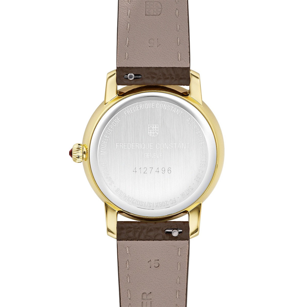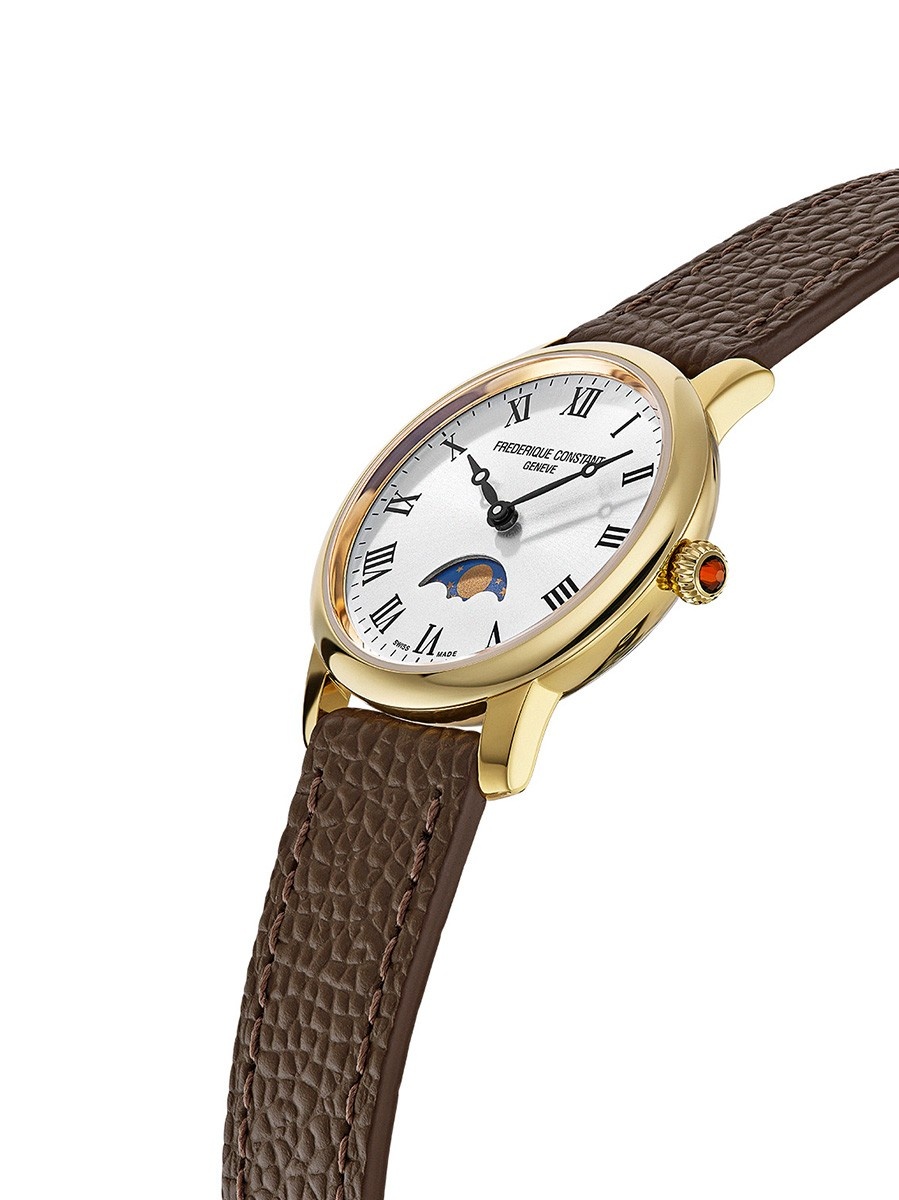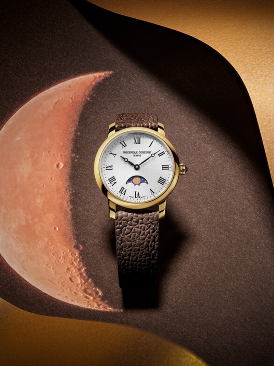 De Classics Slimline Moonphase van Frederique Constant FC-206RS1S5 is een schitterend elegant en tijdloos dameshorloge. Dit model heeft een grootte van 30mm en ligt prachtig vlak op de pols.