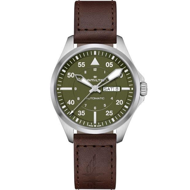 Artikelnummer: H64635560De Khaki Aviation Pilot Day Date is speciaal ontworpen met het oog op ware luchtvaartliefhebbers, als een herinnering aan het verkennende en avontuurlijke karakter van de Khaki. Dit model wordt aangedreven door het H-30 automatische uurwerk met een gangreserve van 80 uur en een Nivachron™-balansveer. Het heeft een dag-datumaanduiding en vergrote cijfers op de wijzerplaat voor een betere afleesbaarheid. De Khaki Aviation Day Date 42 mm combineert een donkerbruine leren band met een olijfgroene wijzerplaat, als eerbetoon aan de avontuurlijke outdoorroots van de Khaki.