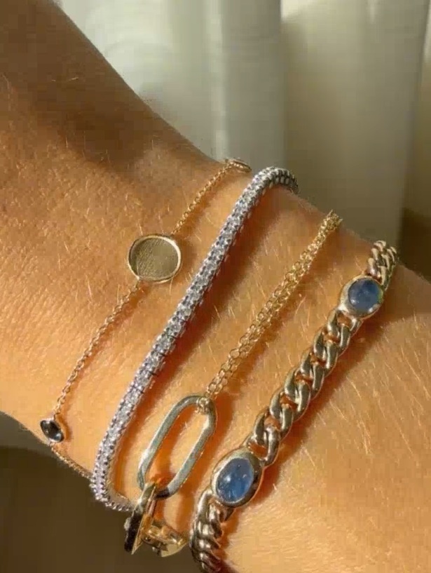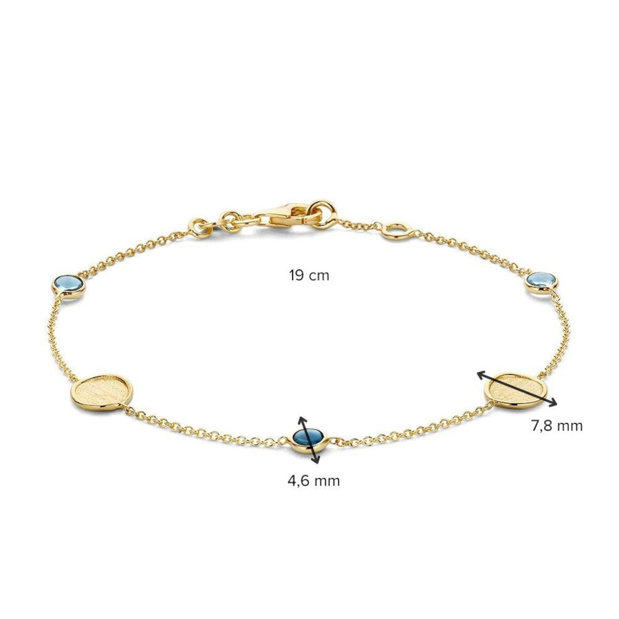 Een prachtige, verfijnde schakel armband die wordt versierd met verschillende elementen. De edelstenen blauwe Topaas en London Blue Topaas vormen een samen prachtig blauw kleurenpalet wat voor een vleugje kleur zorgen in dit juweel. De twee matgouden elementen zorgen voor een moderne uitstraling en maken de armband helemaal van deze tijd. Prachtig om solitair te dragen maar perfect om te combineren met andere armbanden.