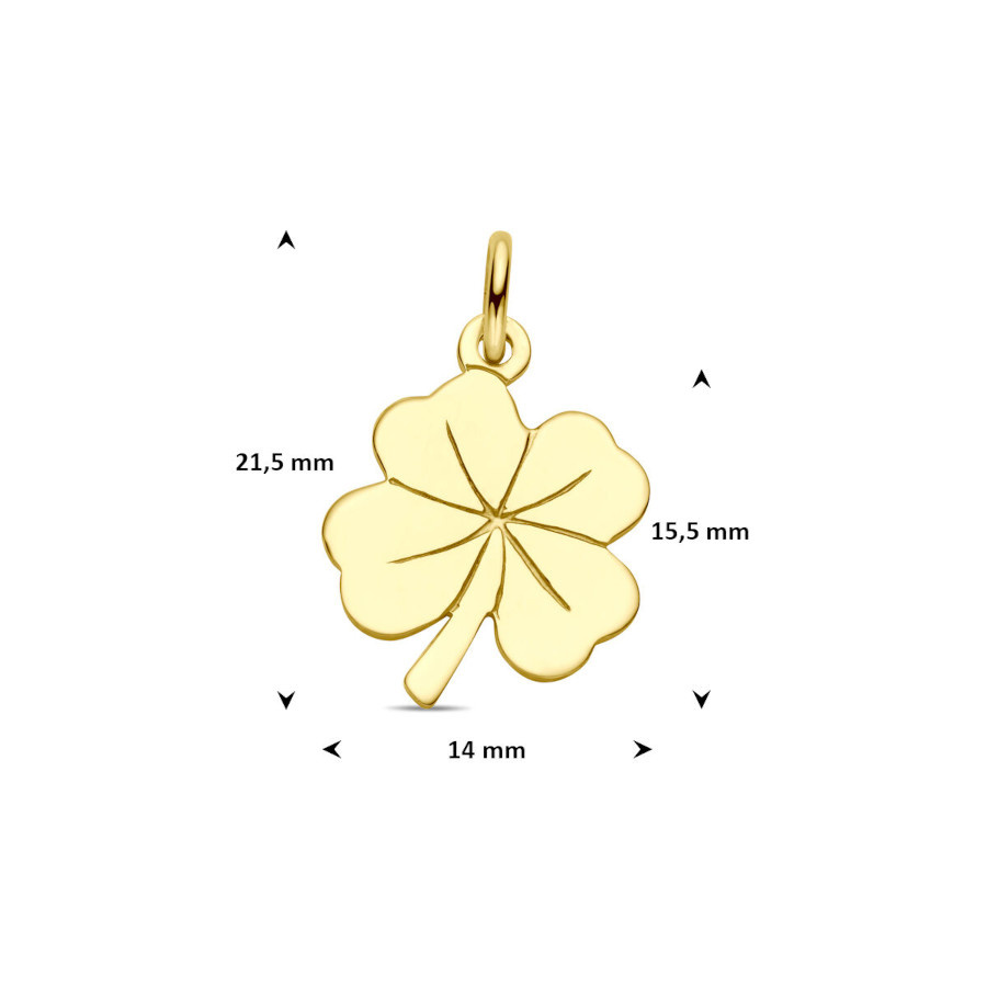 Een klein juweel met een grote betekenis. Met zijn verfijnde formaat van 18 x 14mm heeft het sieraad een subtiele uitstraling, terwijl het 14k geelgoud zorgt voor een luxueus en duurzaam karakter. Een betekenisvol detail dat moeiteloos elke ketting verrijkt. Het klavertje is afgewerkt met een stevig hang oog, waardoor het geschikt is voor zowel fijne als iets dikkere colliers. De hanger wordt geleverd zonder collier, en kan aan je eigen collier of aan een van de vele colliers gedragen worden die wij op voorraad hebben. Perfect om dagelijks te dragen of om cadeau te geven als blijvend teken van geluk, liefde en bescherming.