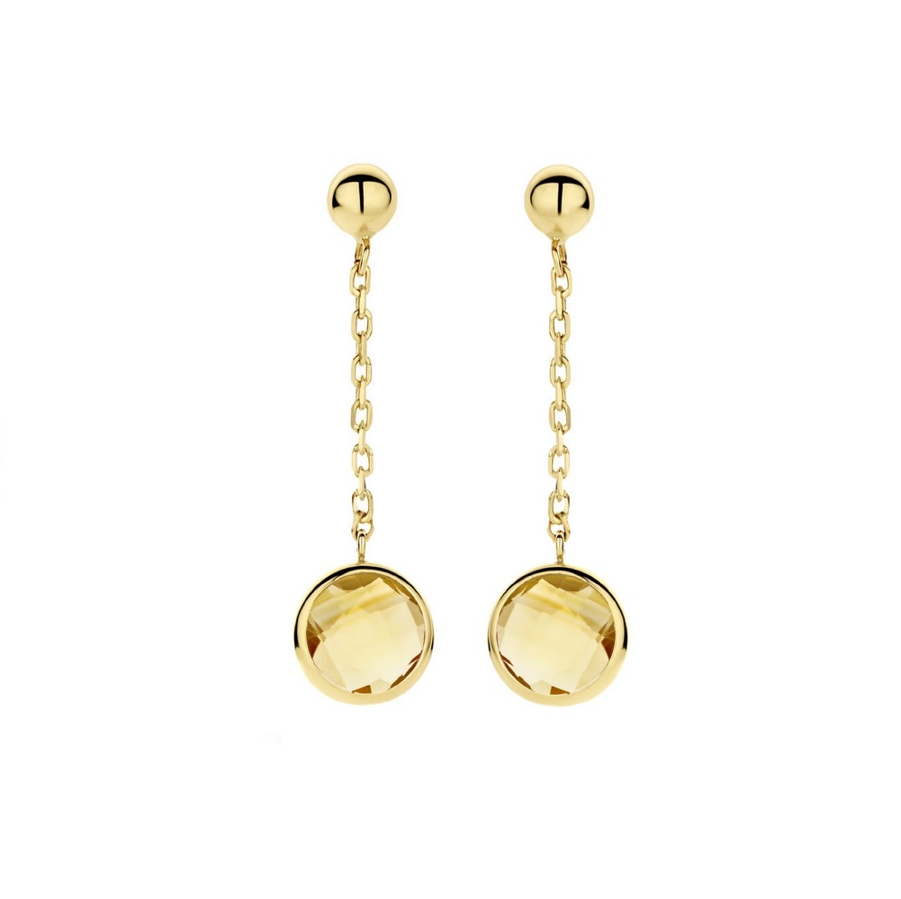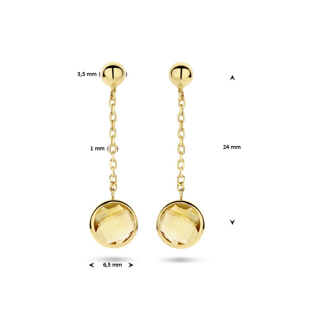 Deze geelgouden oorhangers zijn een juweel voor in de oren. De edelsteen Citrien bungelt subtiel aan een kettinkje voor een luxe uitstraling.
