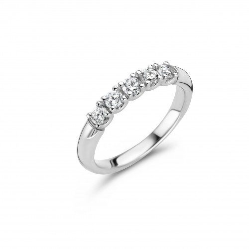 Artikelnummer: 613015Deze witgouden ring is sierlijk, elegant en heeft een fantastisch draagcomfort. Het is een prachtige tijdloze ring met 5 schitterende diamanten dicht naast elkaar gezet.