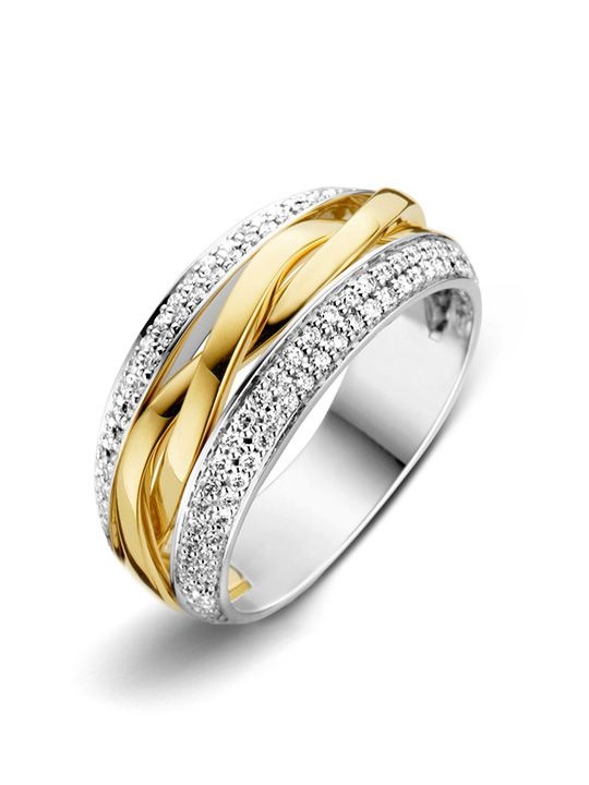Een schitterende, sierlijke en luxe ring waarbij de geelgouden banen gevlochten over elkaar heen lopen. De twee witgouden banen zijn bezet met diamant. Om de diamanten optimaal te laten schitteren zijn zij in een witgouden zetting geplaatst en in totaal zit er 0.45ct in deze ring verwerkt.