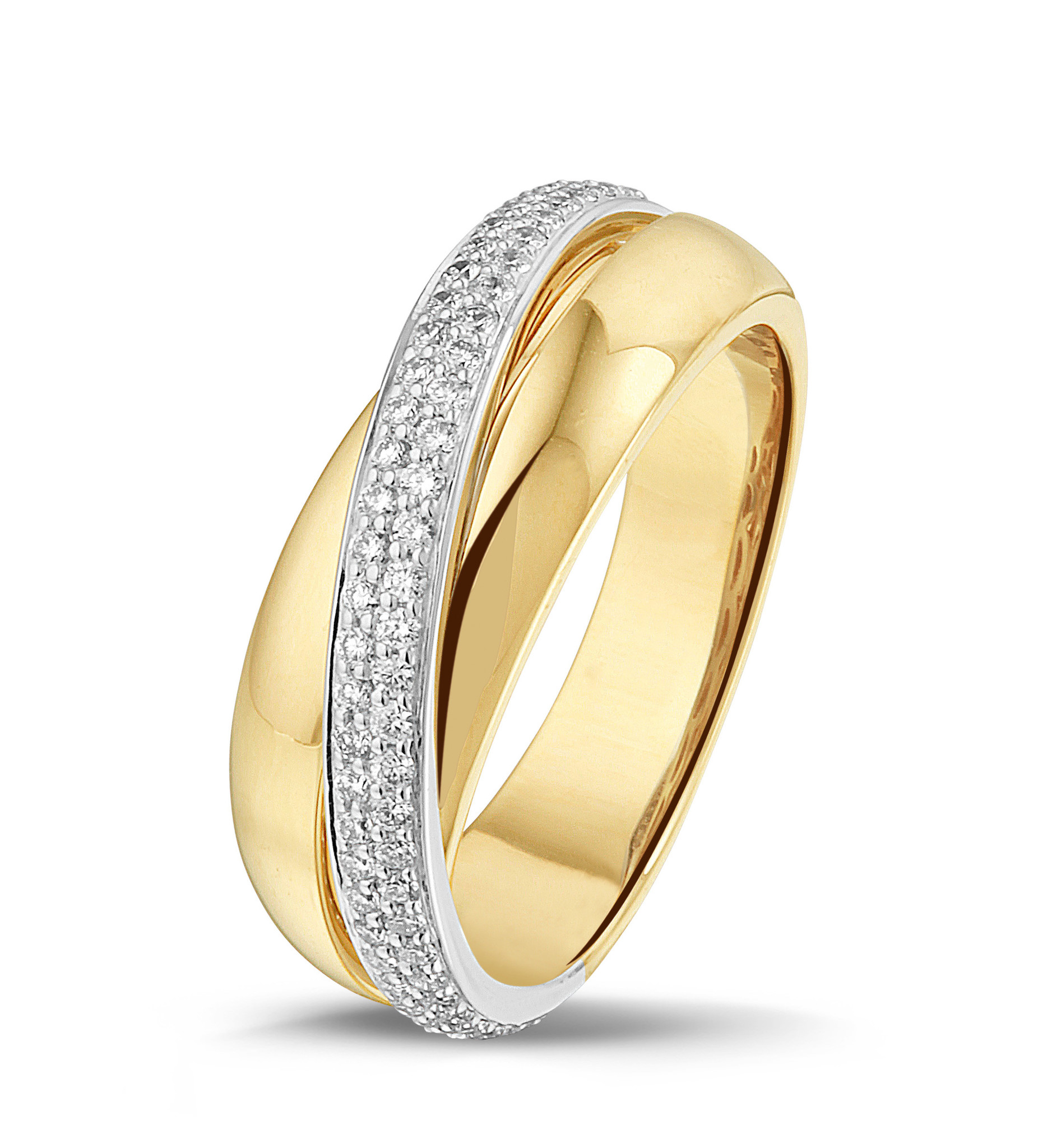 Een schitterende, sierlijke ring waarbij de geelgouden banen over en naast elkaar lopen. De witgouden baan is bezet met diamant en loopt speels over de gouden banen heen. Om de diamanten optimaal te laten schitteren zijn zij in een witgouden zetting geplaatst en in totaal zit er 0.40ct in deze ring verwerkt.