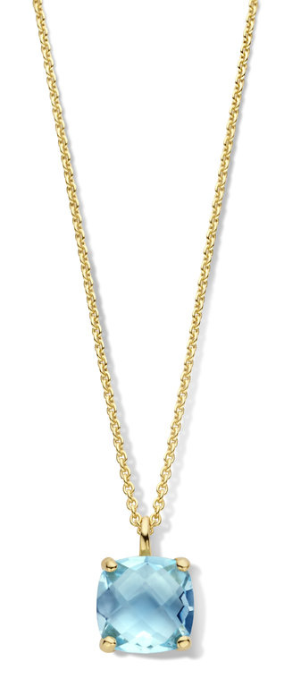 Dit fantastische collier is sierlijk, subtiel en verfijnd. Een geelgouden ketting met blauwe Topaas. De 10x10mm vierkante edelsteen is licht blauw van kleur, schaakbord geslepen en gezet in een chatonzetting met vier zetpoten.