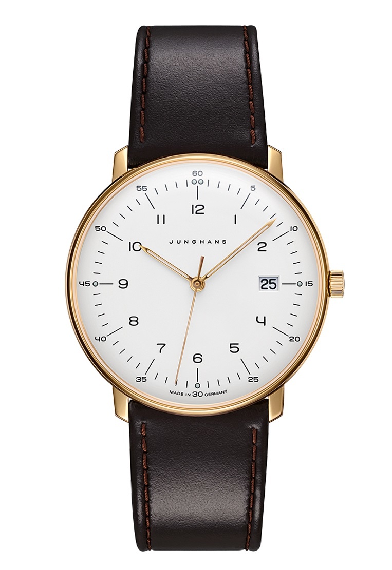 Het Duitse horlogemerk Junghans combineert minimalistisch design met techniek. De Max Bill horloges zijn iconisch vormgegeven. De eenvoud en rust die afstraalt van het Bauhaus ontwerp, geven een zeer herkenbare uitstraling. Deze combinatie van een verzilverde wijzerplaat met een bruine leren band is klassiek en tijdloos. De horlogekast is afwerkt met een gouden PVD-coating en het horloge wordt aangedreven door een quartz uurwerk, en is uitgevoerd met een saffierglas.