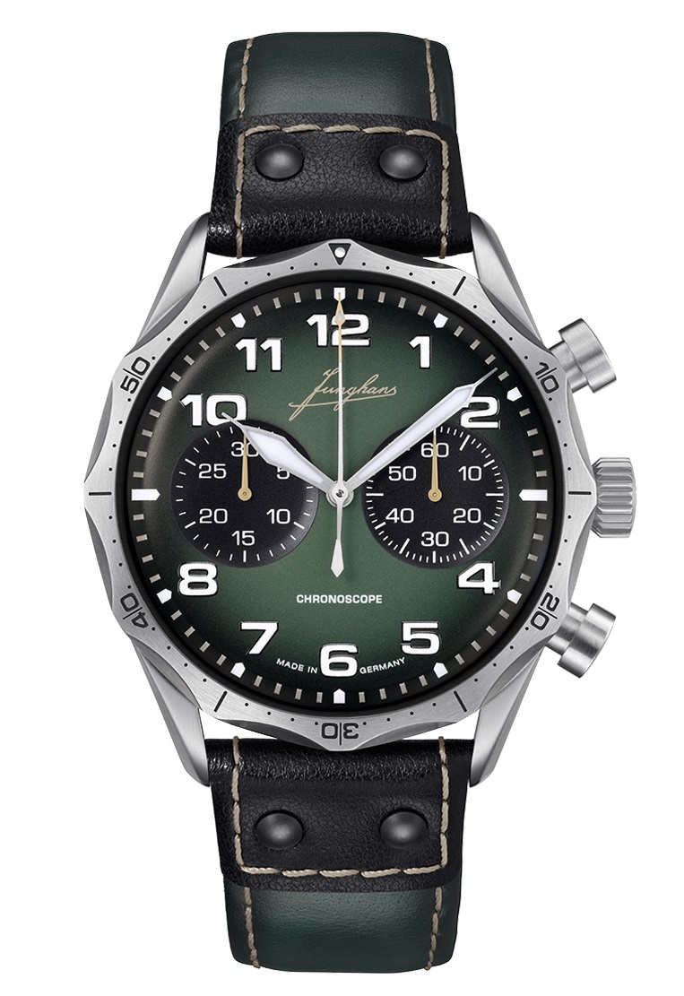 Artikelnummer: 27/3492.00De Junghans Pilot Chronoscope Automaat 43mm 27/3492.00 met groene wijzerplaat is sportief en klassiek met een unieke eigen uitstraling.