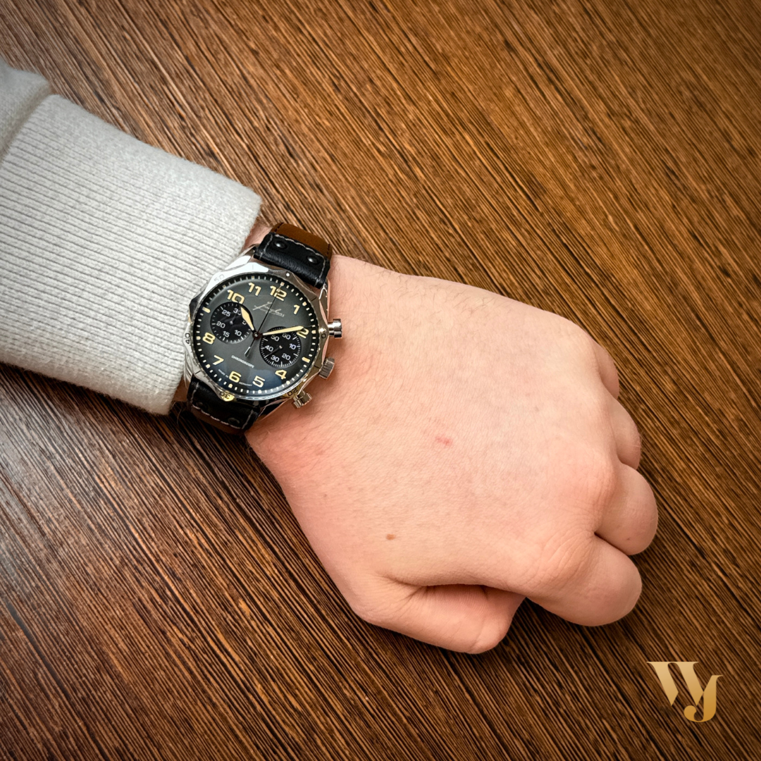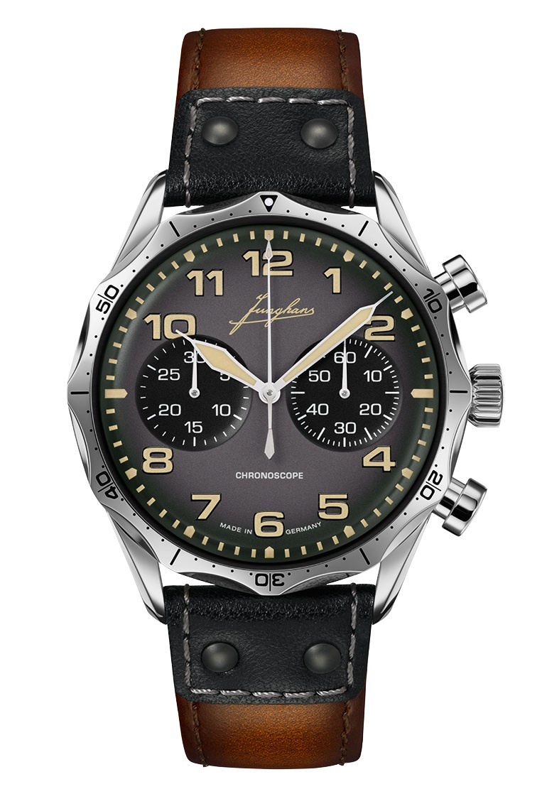In de jaren dertig vervaardigde Junghans bedieningspaneelinstrumenten voor vliegtuigen en luchtschepen, en uiteindelijk ontwierp hij in de jaren vijftig een legendarische pilotenchronograaf voor de Duitse strijdkrachten. De fascinatie voor de luchtvaart komt duidelijk naar voren in de Pilot: opvallende lichtgevende cijfers en wijzers op de wijzerplaat zorgen voor een optimale leesbaarheid. De ergonomisch ontworpen rand zorgt voor uitzonderlijke grip en een uniek uiterlijk.