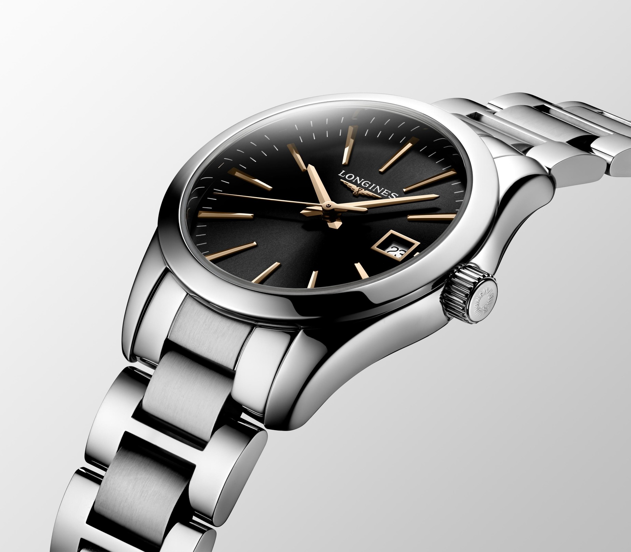 Dit Conquest Classic-horloge van Longines heeft een quartz uurwerk dat geplaatst is in een edelstalen kast. Op de zwarte wijzerplaat zijn roségoud kleurige indexen geplaatst. Aan de kast zit een zilverkleurige edelstalen horlogeband met een vouwsluiting. Het is voorzien van een saffierglas dat krasbestendig is.