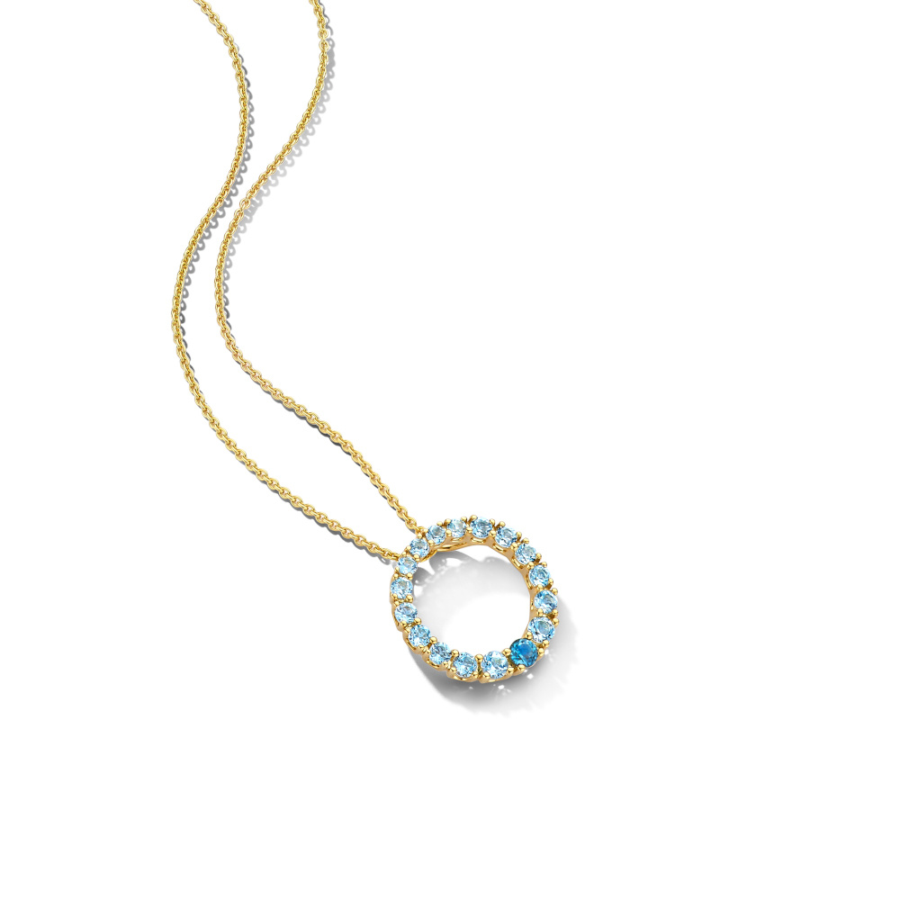 Deze geelgouden hanger heeft een open ronde vorm en wordt rondom bezet met de prachtige edelsteen Sky Blue Topaas. Onderaan in het midden wordt de hanger versierd met één London Blue Topaas. Hierdoor krijgt de hanger een elegante maar speelse uitstraling. Het hangertje wordt vast gehouden door een 1.1mm anker collier en is 45cm lang.
