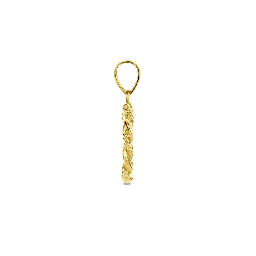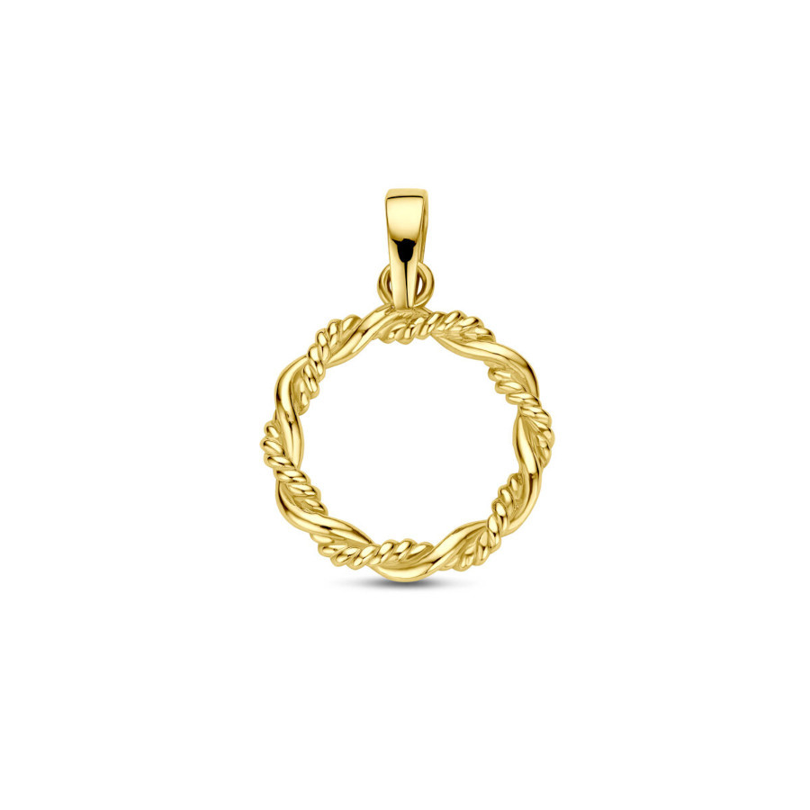 Twee gouden draden in en over elkaar zorgen samen voor een prachtig open rondje. De twee banen hebben allebei een verschillende afwerking. De gladde baan en getorste baan vormen samen een prachtig geheel. De hanger heeft een grootte van 21mm. Deze hanger wordt geleverd zonder collier, en kan aan je eigen collier of aan een van de vele colliers gedragen worden die wij op voorraad hebben.