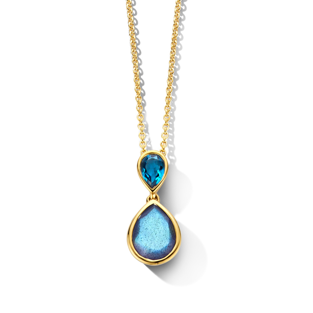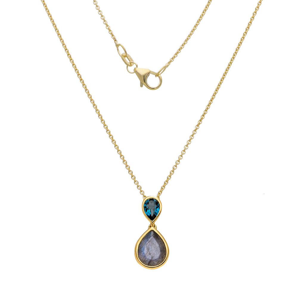 Artikelnummer: 614080Dit geelgouden anker schakel collier is klassiek met een speels tintje. De strak vormgegeven hanger bestaat uit 2 druppels en is gezet met dipe blauwe London blue topaas en grijze Labradoriet met een prachtige blauwe gloed in de steen. De onderste druppel is 9x7mm groot en de bovenste 6x4mm.