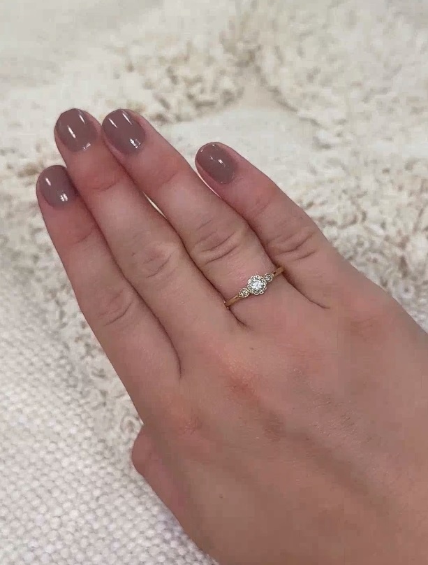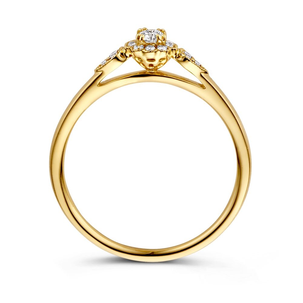 De ring krijgt een vintage tintje door de schitterende briljanten die zijn gezet in een subtiele bloemendesign. Aan beide zijde een extra schittering in peervorm. De middensteen heeft een grootte van 0.14ct en in totaal zit er 0.21ct diamant in deze ring verwerkt.