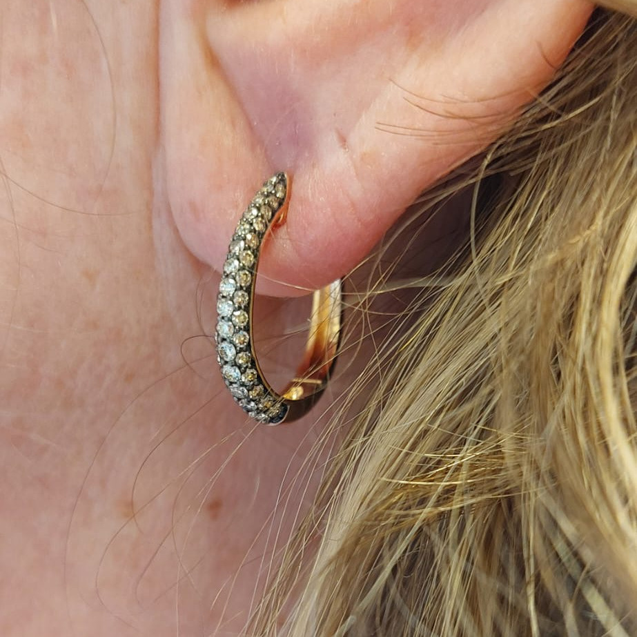 Artikelnummer: 612444Deze luxe rosegouden creolen zijn ovaal van vorm en pavé gezet met bruine diamanten. Ze zijn op het oor smal en lopen iets breder uit, wat een zeet verfijnde uitstraling geeft. De fijne zetpootjes zijn zwart gerhodineerd voor een subtiele stoere uitstraling. Ze zijn 18mm groot en 3mm breed. Ze sluiten doormiddel van een klap systeem.