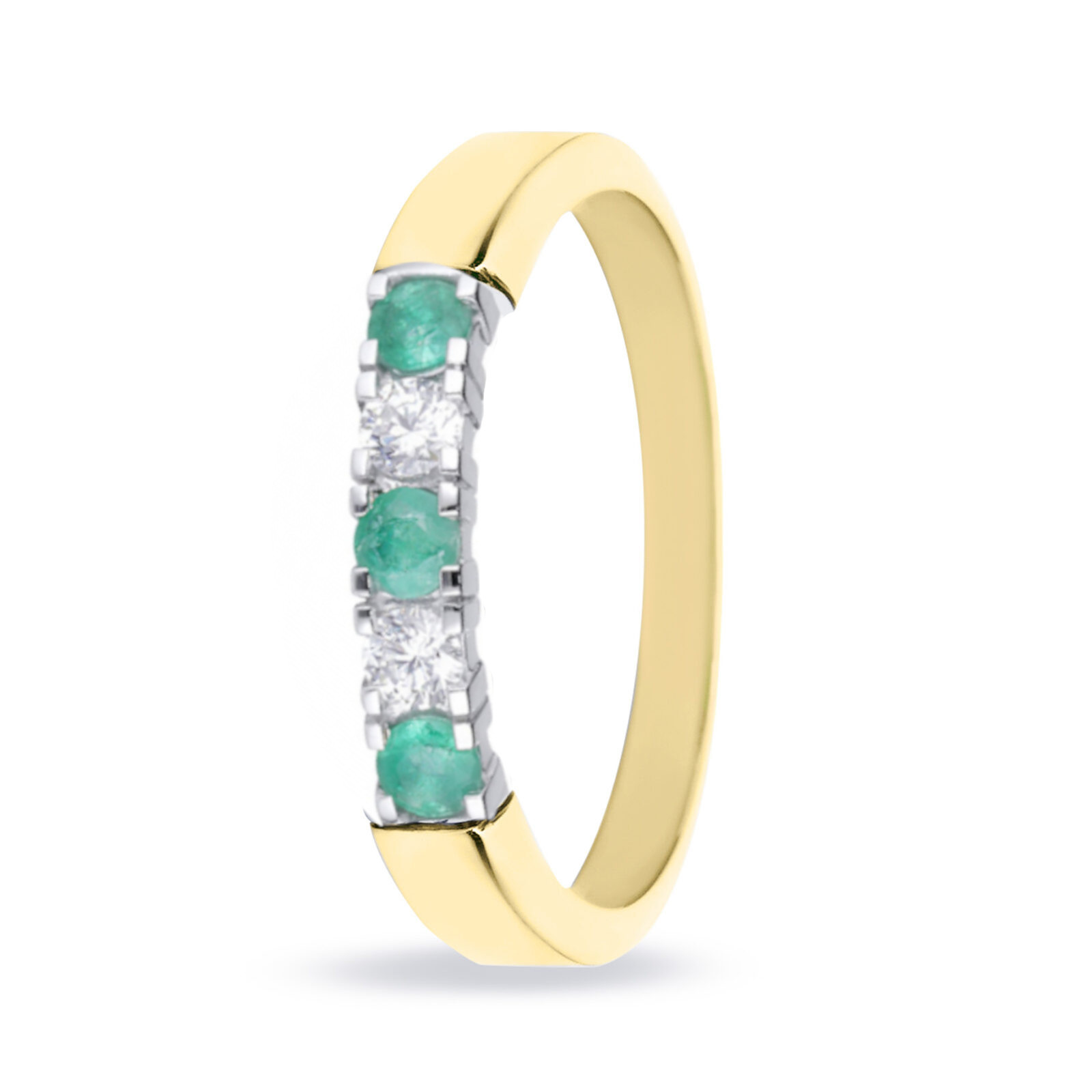 Artikelnummer: RIN1703-2PW-3SMADeze klassieke gouden alliance ring is gezet met 2 diamanten en 3x groene smaragd in een witgouden zetting. De ring is strak vormgegeven met vlakke zijkant en een licht bolle bovenkant.