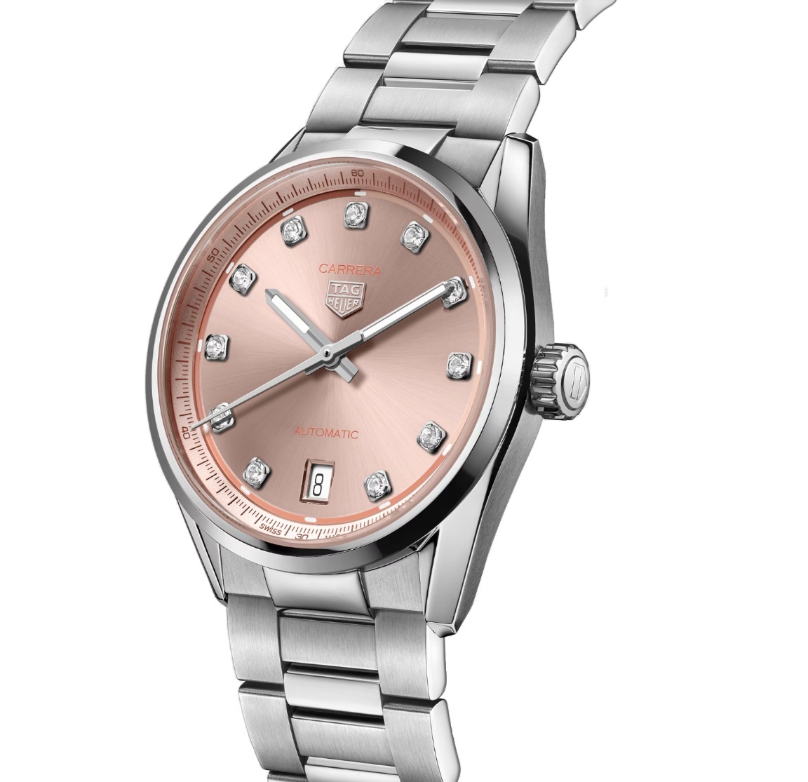 De poederroze, sunray-geborstelde wijzerplaat creëert een vrouwelijke en verfijnde look. De met diamanten bezette indexen voegen een vleugje luxe toe en belichamen de geest van de TAG Heuer Carrera. De kenmerkende stalen horlogeband band loopt taps toe voor een betere pasvorm, maar zorgt ook voor dagelijks comfort. Dit automatische horloge is uitgerust met het Calibre 7-uurwerk, dit biedt een gangreserve van 56 uur. De geplaatste datumvenster op 6 uur biedt functionaliteit en behoudt tegelijkertijd haar elegante esthetiek.