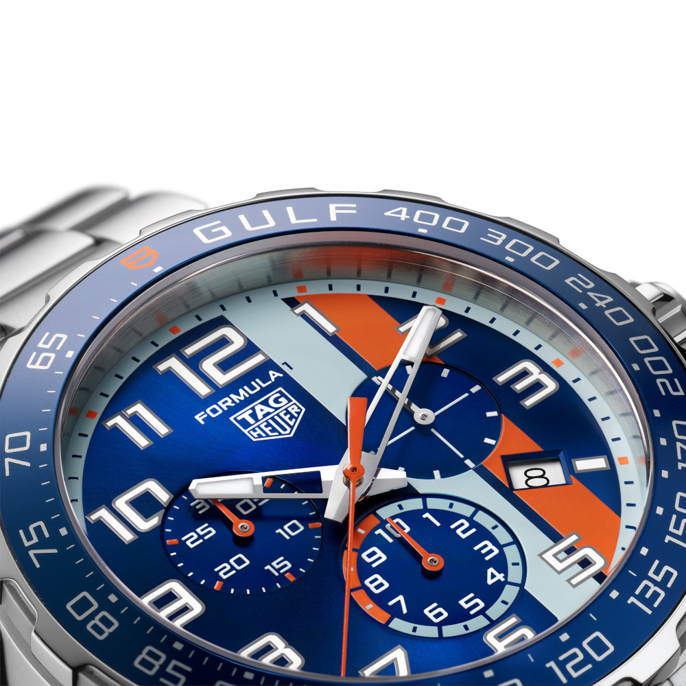Dit speciale Formula 1 horloge is uitgevoerd in de kenmerkende Gulf kleuren blauw en oranje. Over de blauwe wijzerplaat lopen te strepen in die kleuren en is voorzien van comfortabele metalen. In de achterdeksel is het Gulf logo gegraveerd.