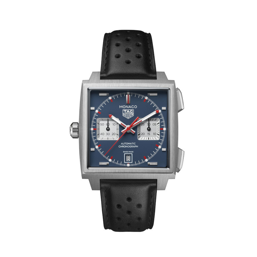De blauwe opaline wijzerplaat contrasteert met zilverkleurige sub-dials, rode accenten en lichtgevende rodium-geplateerde wijzers voor scherpe leesbaarheid. Trouw aan de herinterpretatie van de kenmerkende designcodes van de originele Heuer Monaco uit 1969, herinnert elk detail aan de gedurfde esthetiek die Steve McQueen droeg in de film Le Mans (1971).