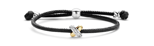 Een zacht lederen, zwarte bandje met een subtiel kusje. Het zilveren, gerhodineerde kusje is gecombineerd met één baan 18k geelgoud en één baan bezet met schitterende diamanten. Prachtig om solitair te dragen maar perfect om te combineren met andere armbanden.