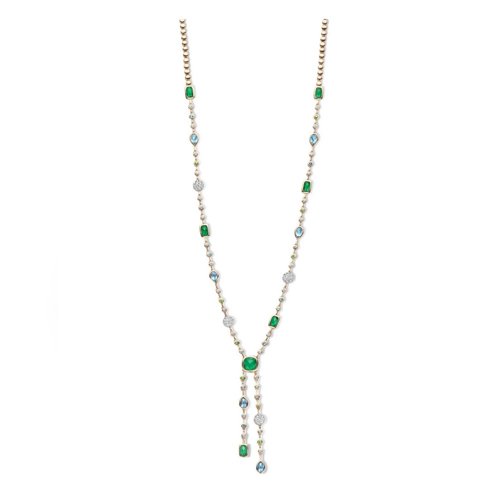 Dit betoverende roségouden collier met diamant bestaat uit afwisselend gevormde ornamentjes gezet met triplet Smaragd, blauwe Topaas, groene Granaat en diamant. Om de diamanten optimaal te laten schitteren zijn zij in een witgouden zetting geplaatst en in totaal zit er 0.71ct in dit collier verwerkt. Het collier is door haar kleurenpalet en haar unieke design een absolute showpiece.