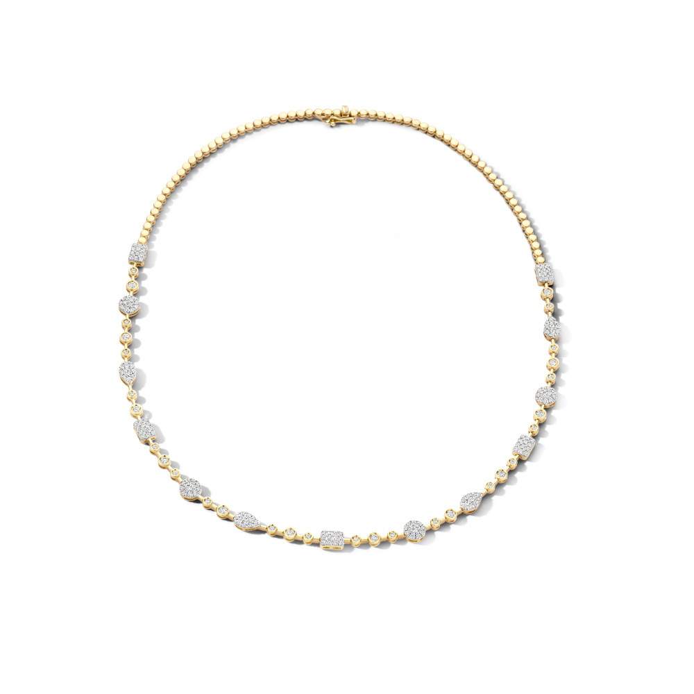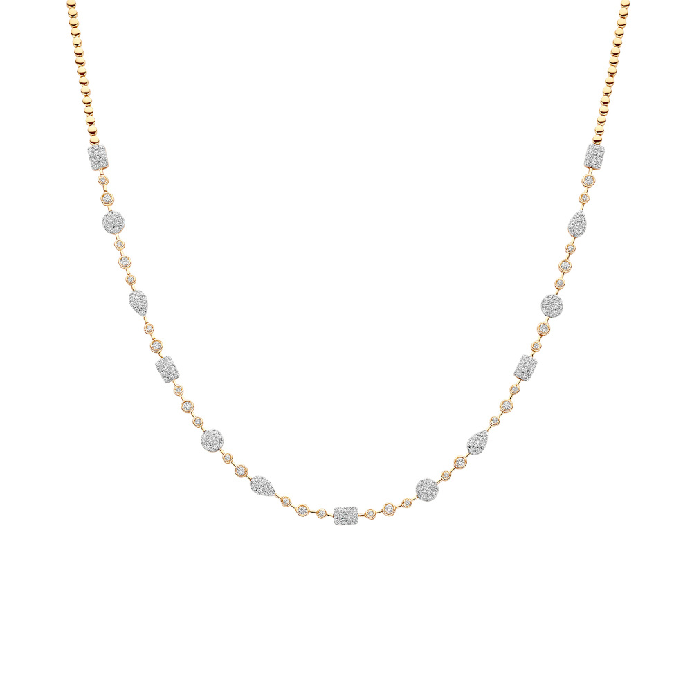 Dit betoverende geelgouden collier met diamant bestaat uit afwisselend gevormde ornamentjes gezet met diamant. Het gedeelte in de hals is gemaakt uit verbonden bolletjes, wat een sportief en draagbaar karakter geeft aan deze eye-catcher!