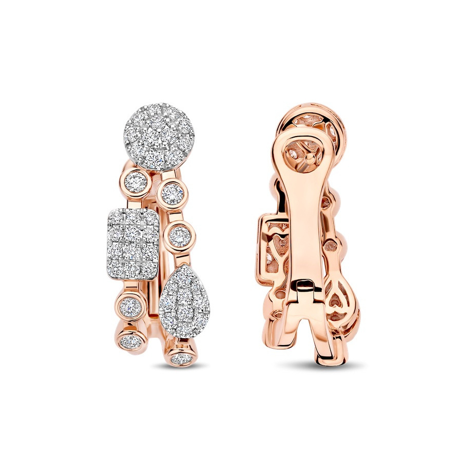Deze betoverende creolen zijn aan de voorzijde bezet met schitterende diamanten. Het a symmetrische ontwerp geven de oorringen een speelse maar luxe uitstraling. De diamanten in een pavé zetting zijn gezet in een witgouden zetting voor een optimale schittering en worden versierd met subtiele diamanten in een roségouden gladomzetting. De diamanten hebben een totaal gewicht van 0.97ct.