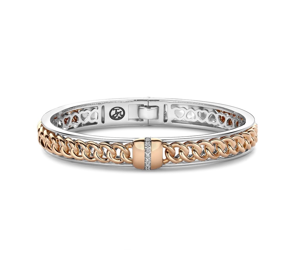 Deze fantastische armband is een perfecte mix van 18k Roségoud en zilver. De zilveren gerhodineerde bangle wordt versierd met roségouden schakels met daarboven op een ornament bezet met een streepje diamant. De briljanten hebben een totaalgewicht van 0.07ct.