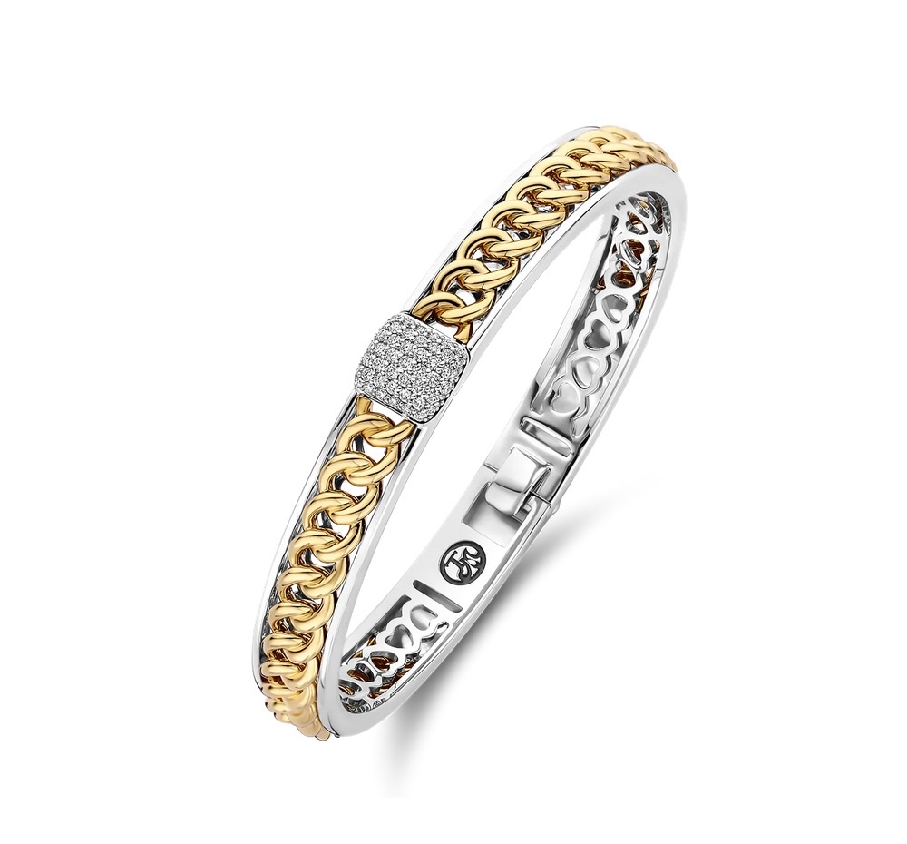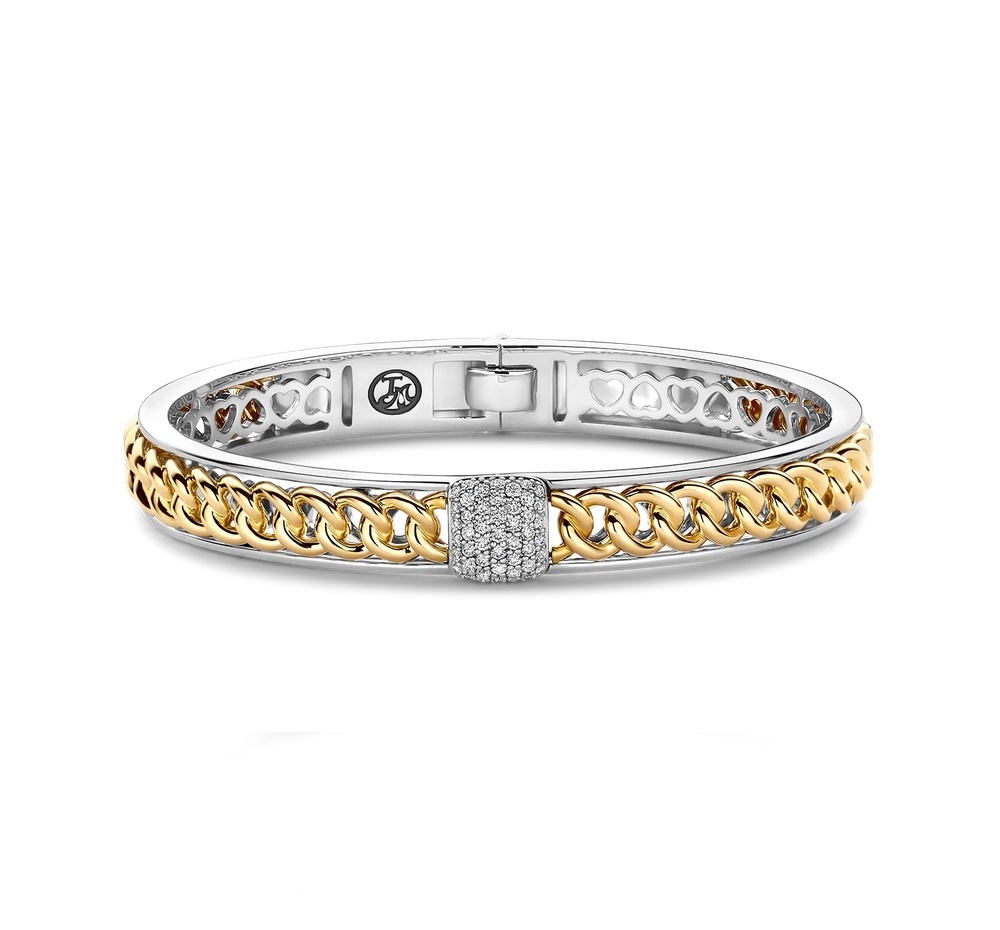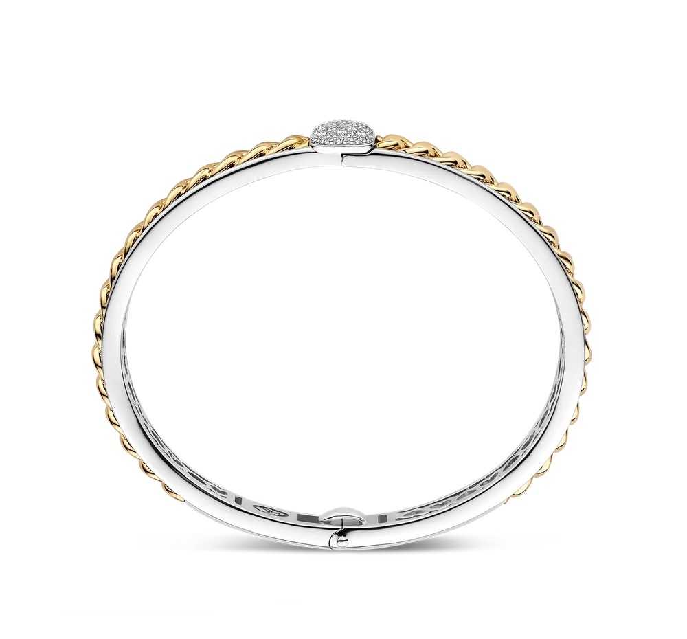 Deze fantastische armband is een perfecte mix van 18k geelgoud en zilver. De zilveren gerhodineerde bangle wordt versierd met geelgouden schakels met daarboven op een ornament bezet met diamant. De briljanten hebben een totaalgewicht van 0.37ct.