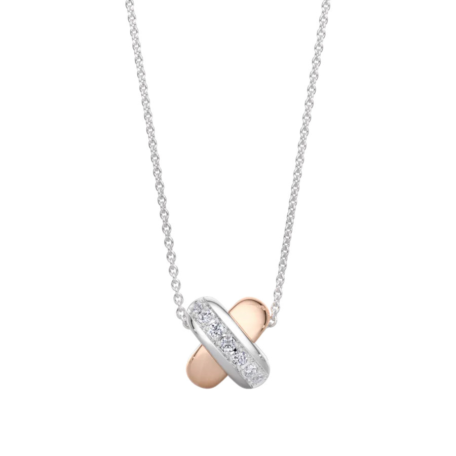 Een kusje met diamant op je hals. Soms is dit alles wat je nodig hebt als versiering. Dit collier laat zien dat eenvoud en perfectie fantastische samen gaan met dit liefelijke kusje bezet met diamant. Een prachtig zilveren gerhodineerd kettinkje met een tweekleurige kusjes hanger van gerhodineerd zilver. Het kusje heeft één baan van 18k roségoud en één baan bezet met schitterende diamanten. De briljanten hebben een totaal gewicht van 0.07ct. Het kettinkje heeft meerdere tussenoogjes op 40, 43 en 45cm waardoor er gespeeld kan worden met de lengte.