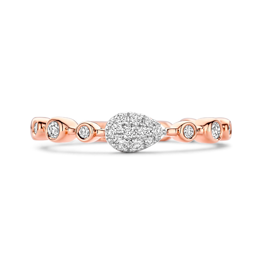 Deze betoverende ring heeft een druppelvormige ornament die pavé bezet is met diamanten. Om de diamanten optimaal te laten schitteren zijn zij in een witgouden zetting geplaatst. De ring wordt naast het ornament versierd met ronde vormen met daarin subtiele briljanten. Door de verschillende vormen krijgt de ring een elegante maar speelse uitstraling en is het echt een juweel om de vinger.