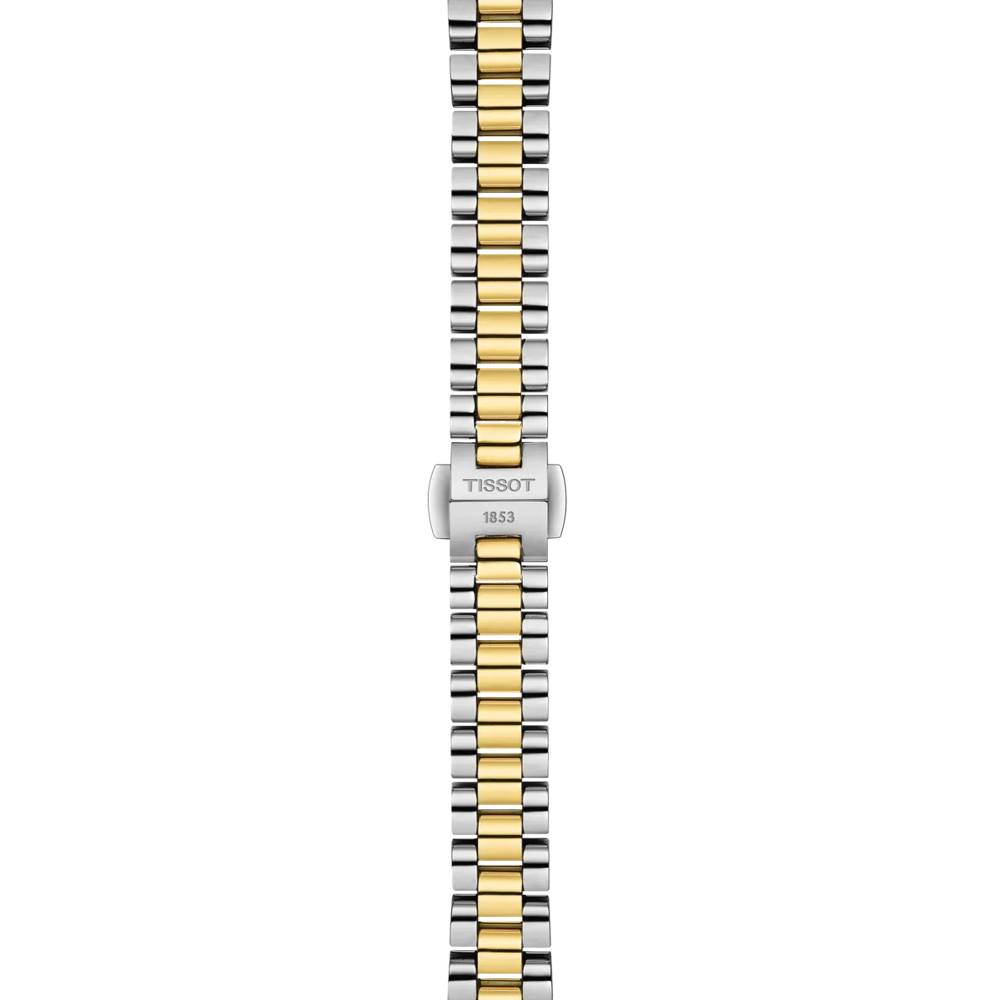 Dit schitterende tweekleurige horloge heeft een grootte van 28mm met een witte parelmoer wijzerplaat. De wijzerplaat wordt versierd met een randje van bewerkt metaal wat zorgt voor een extra, subtiele schittering. De goudkleurige wijzers hebben een sierlijke vorm waardoor het horloge vrouwelijk en tijdloos is maar een speelse touch krijgt doordat de kroon op de 2 uur zit i.p.v. op de 3 uur.