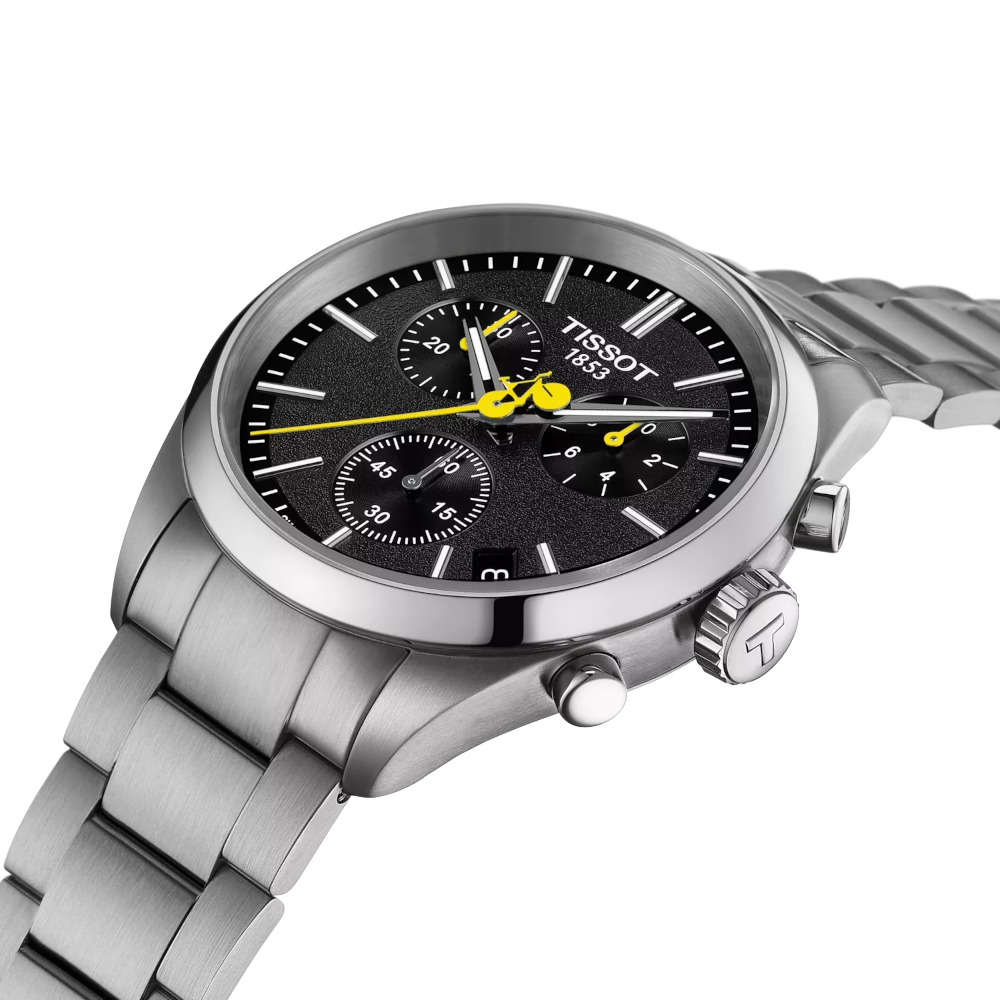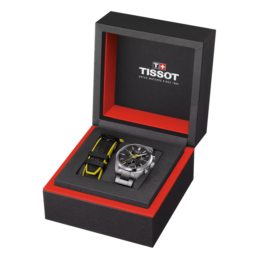 De Tissot PR100 collectie biedt meerdere stijlen maar dit horloge laat zien dat eenvoud perfect samen gaat met de tijd van nu. Een strak design met een schitterende zwarte wijzerplaat en gele Tour the France accenten. Het horloge wordt geleverd met twee banden; de stalen matte band maakt het horloge helemaal af - de rubberen band met gele zijkanten geven het horloge een stoere en opvallende uitstraling. Het horloge beschikt over een quartz uurwerk met een waterdichtheid van 100m en twee jaar garantie.