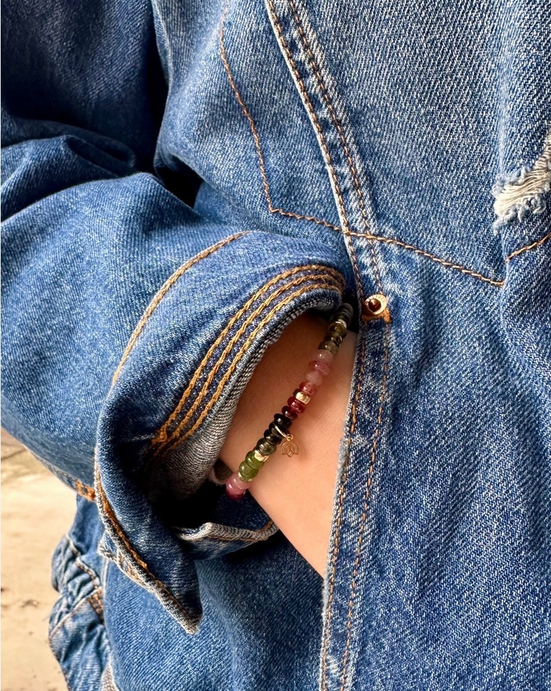 Deze prachtige armband is een combinatie van diverse tinten van Toermalijn en geelgouden ornamenten.