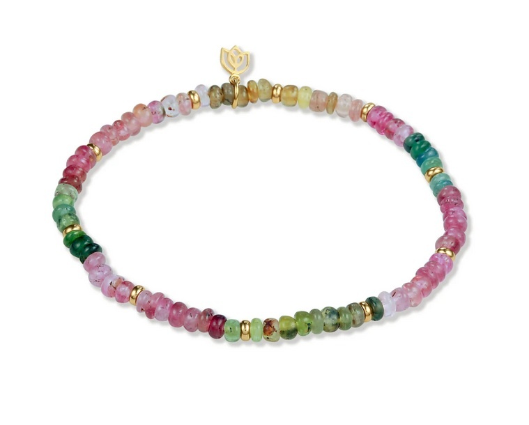 Deze prachtige armband is een combinatie van diverse tinten Toermalijn en geelgouden ornamenten.