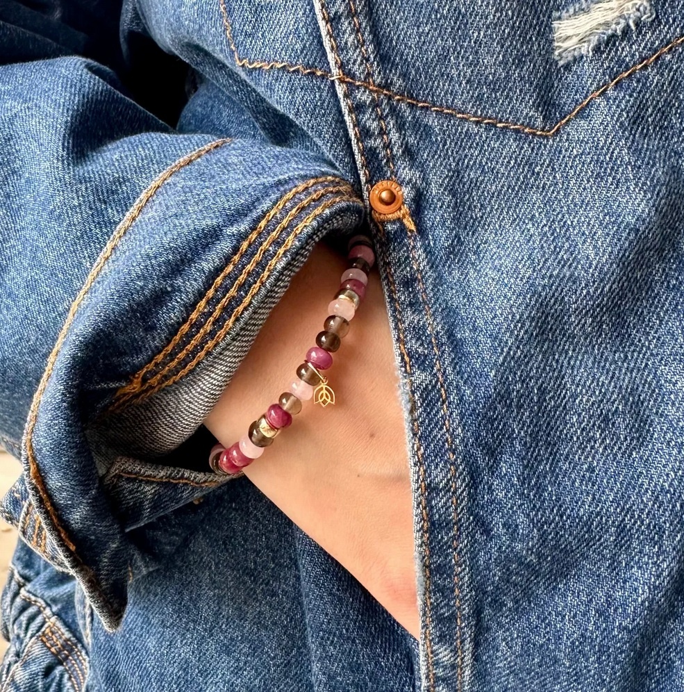 Deze prachtige armband is een combinatie van Robijn, Rozenkwarts, Theekwarts en geelgouden ornamenten.